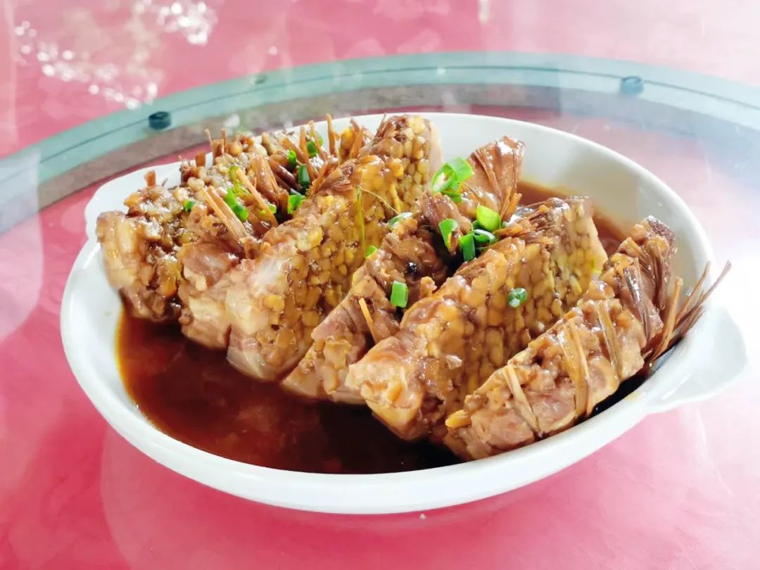 “禾秆冚珍珠”,是一句粤语,形容珍贵的物品被掩盖,又叫“禾草扎猪肉”,是一道非遗美食,主要选用上乘的绿豆,放进优质的本地土猪肉中,再以禾秆草包扎好,放入秘制的浓汤中煮制而成,是疍家菜系中“浸”技法的代表。