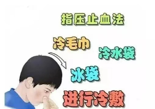 身体微微前倾,用手指捏住鼻梁下方的软骨部位,持续约5~15分钟。除此之外,放一个小冰袋在鼻梁上也有迅速止血的效果。