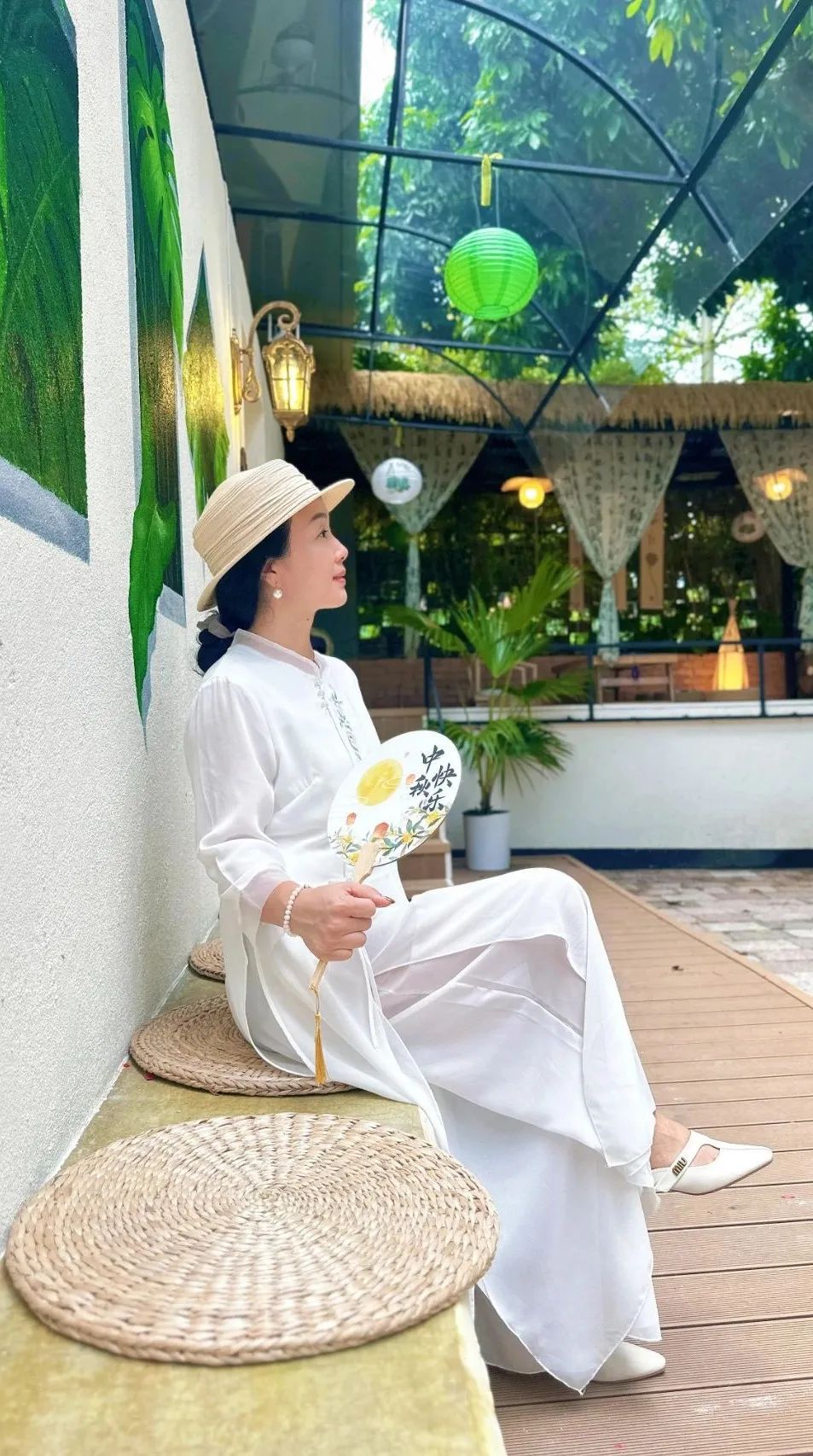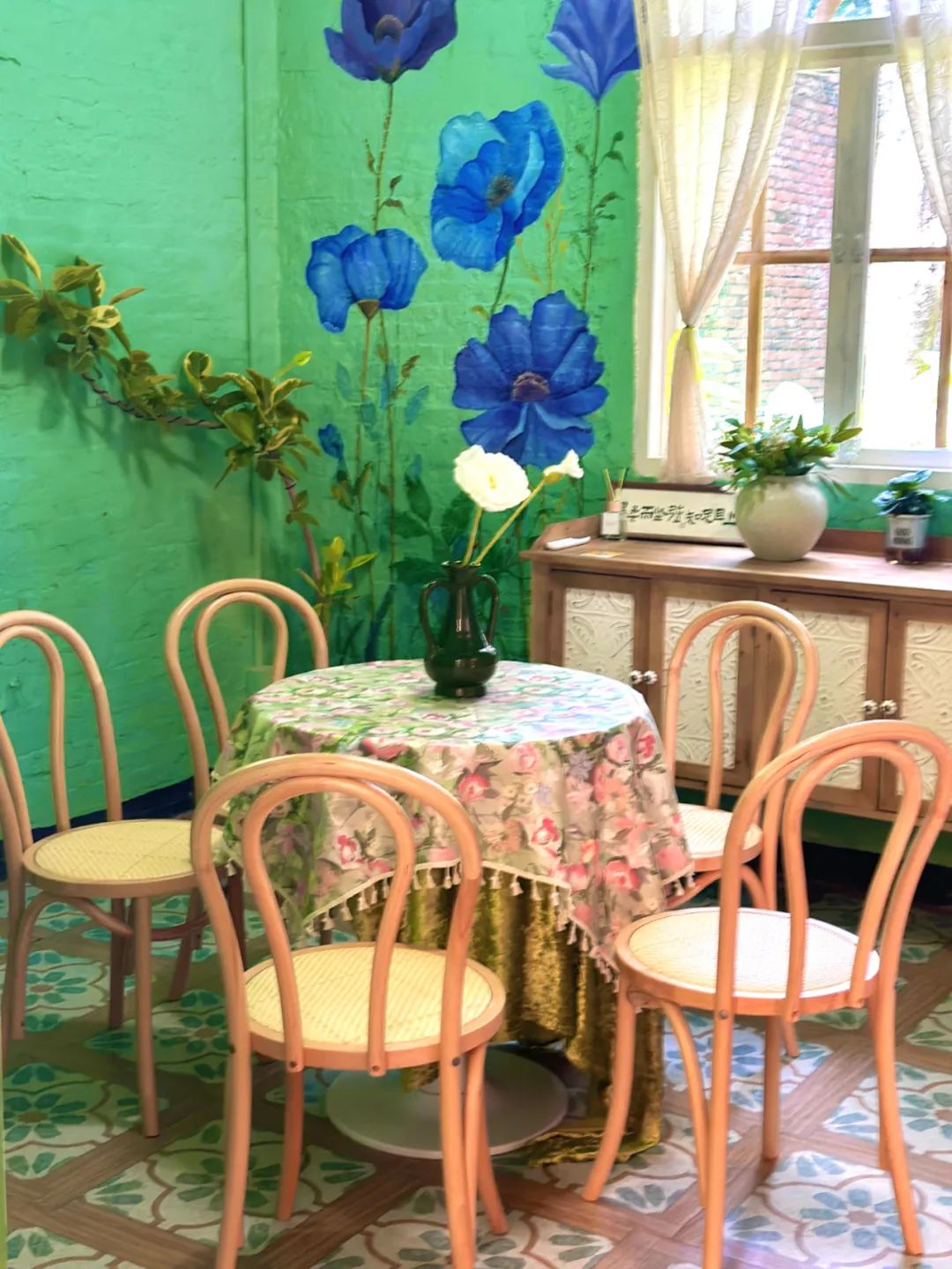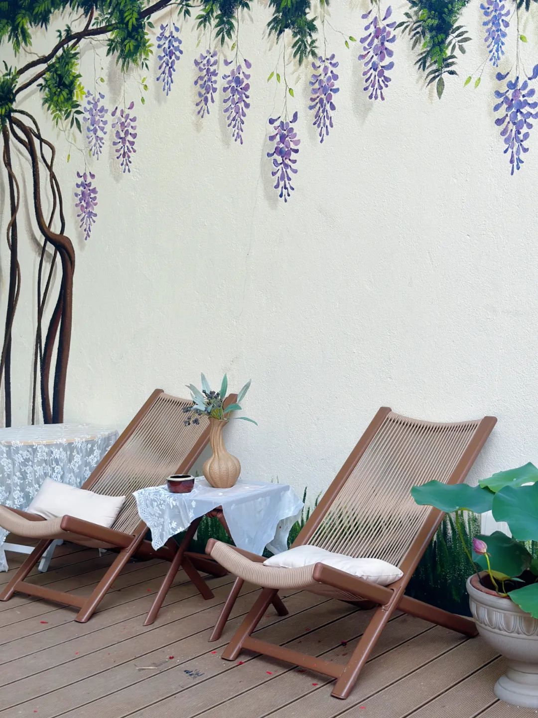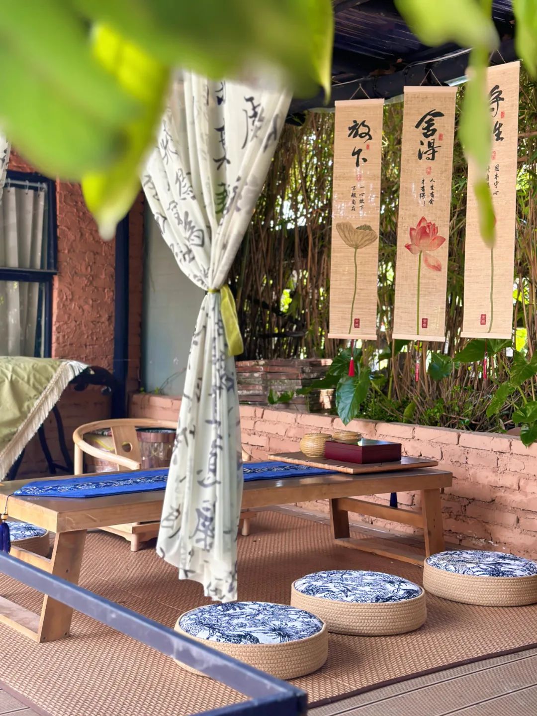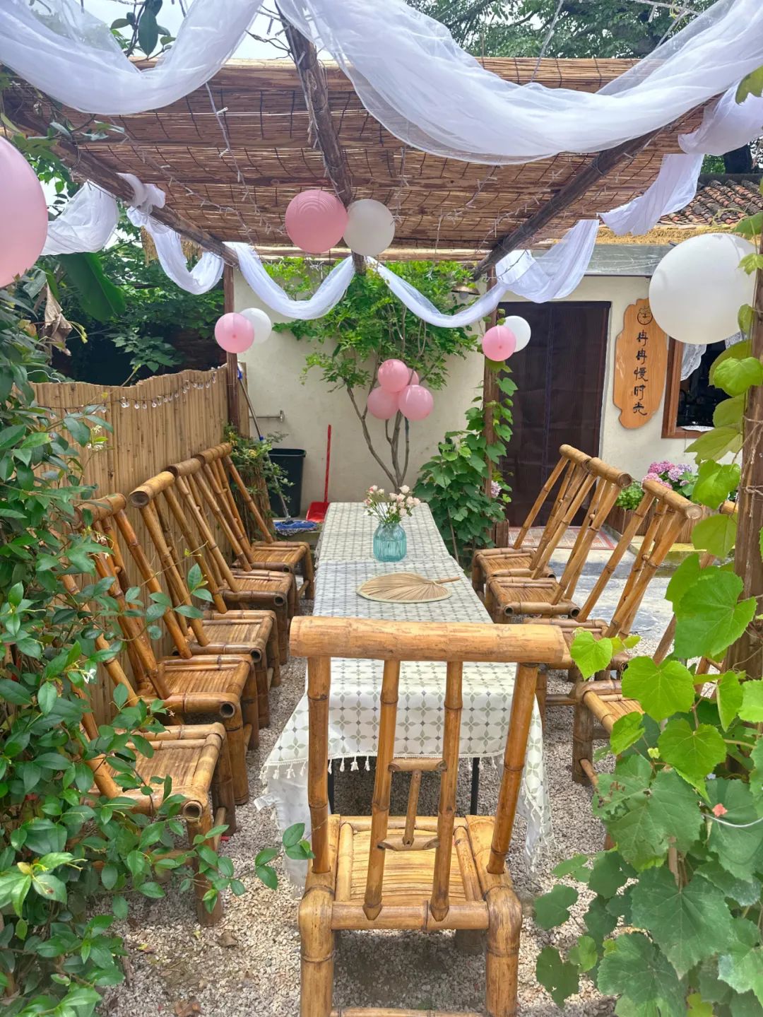搭配鲜花、竹制桌椅