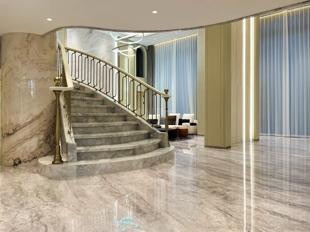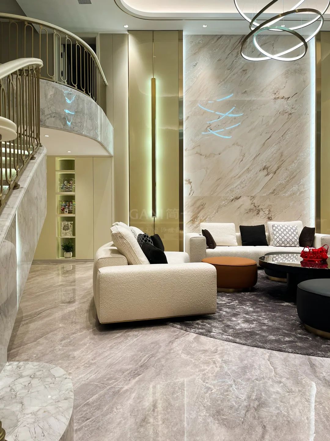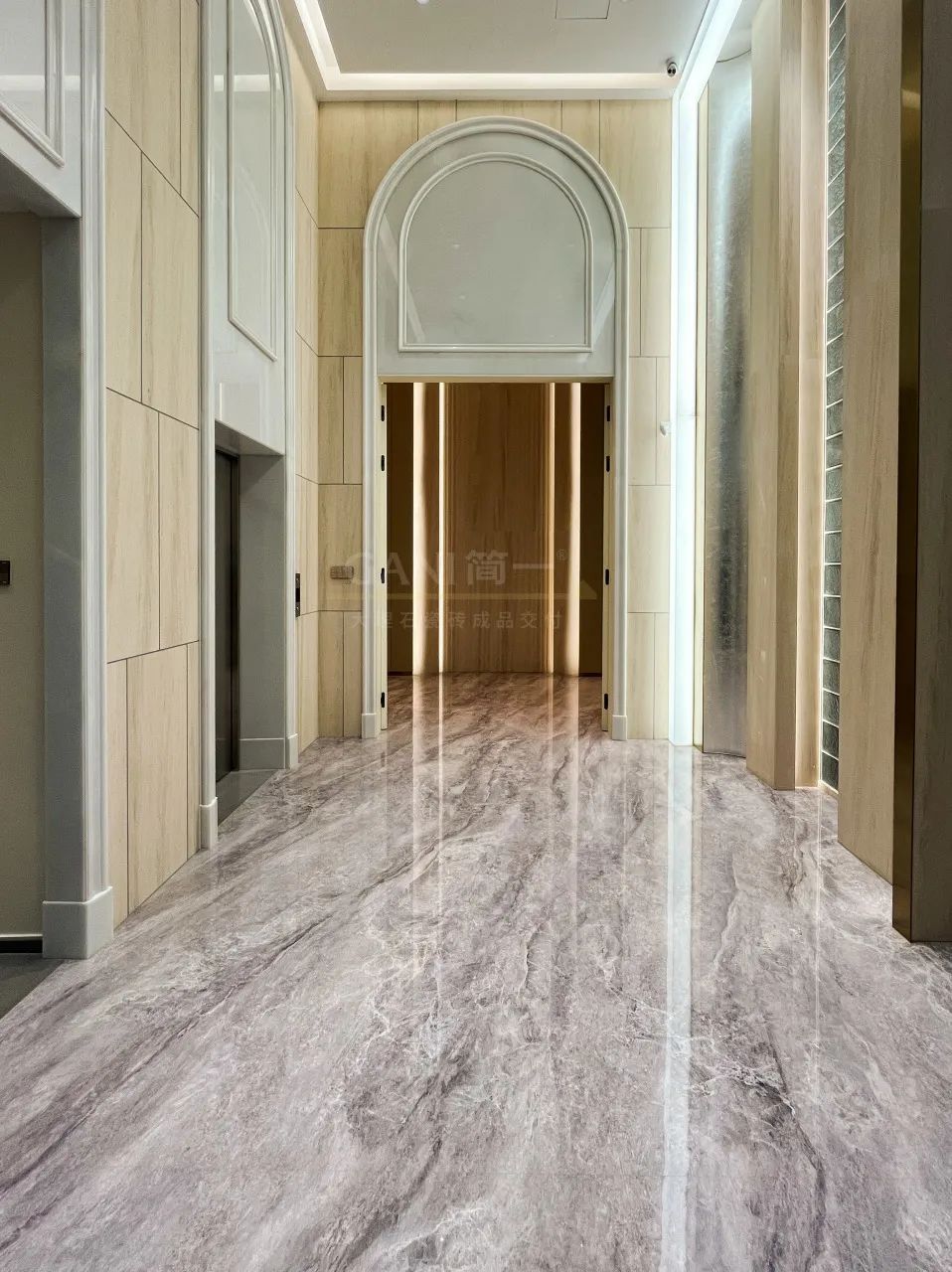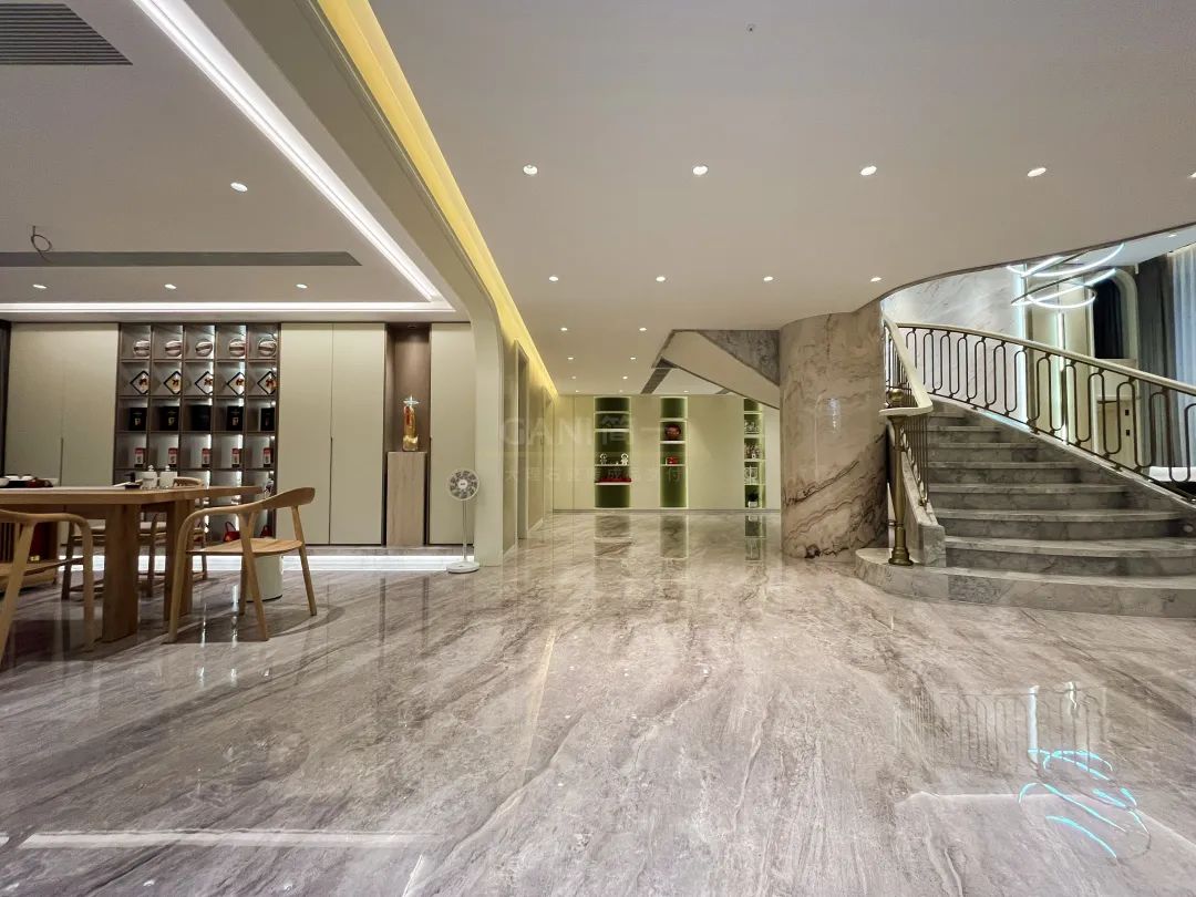 在纷繁复杂的世界里 追求简单而有质感的生活 是对一切美好事物的真挚向往 本期,走进 @广东·东莞 舒展又奢华的千方别墅,一探究竟!一同感受处处丰盈的美好生活方式~ 房屋信息 案例坐标:广东·东莞松湖悦府 案例户型:1000㎡别墅 装修风格:现代轻奢 案例用砖:简一云朵灰、意大利云灰、云雾白 案例鉴赏 本屋亮点:大理石瓷砖<0.5mm密缝连纹 玄关之间 艺术渗透 地面|简一云朵灰实景效果 玄关处,柔和光线巧妙地营造出一种雅致而私密的归家氛围,浅系木饰面搭配线条流畅的大理石瓷砖纹理,打造纯粹的空间底蕴之美。玻璃元素与灵动绿植的加持,建构此处透彻内在。 会客厅 地面|简一云朵灰实景效果 别墅整体设计奢华大气,开阔的挑高布局赋予空间无尽纵深感。家居搭配上不在于物质的堆砌,而在于心灵的满足与愉悦,让向往的生活触手可及。 地面|简一云朵灰实景效果 会客厅布局尺度舒适,生活的幸福密码就藏在其中。地面铺设云朵灰大理石瓷砖,纹理连贯流畅 触感温润如玉,自带一份来自天然的奢华质感,能让人在忙碌与喧嚣中放松下来,用心去感受日常里的每一个细微瞬间。 地面|简一云朵灰实景效果