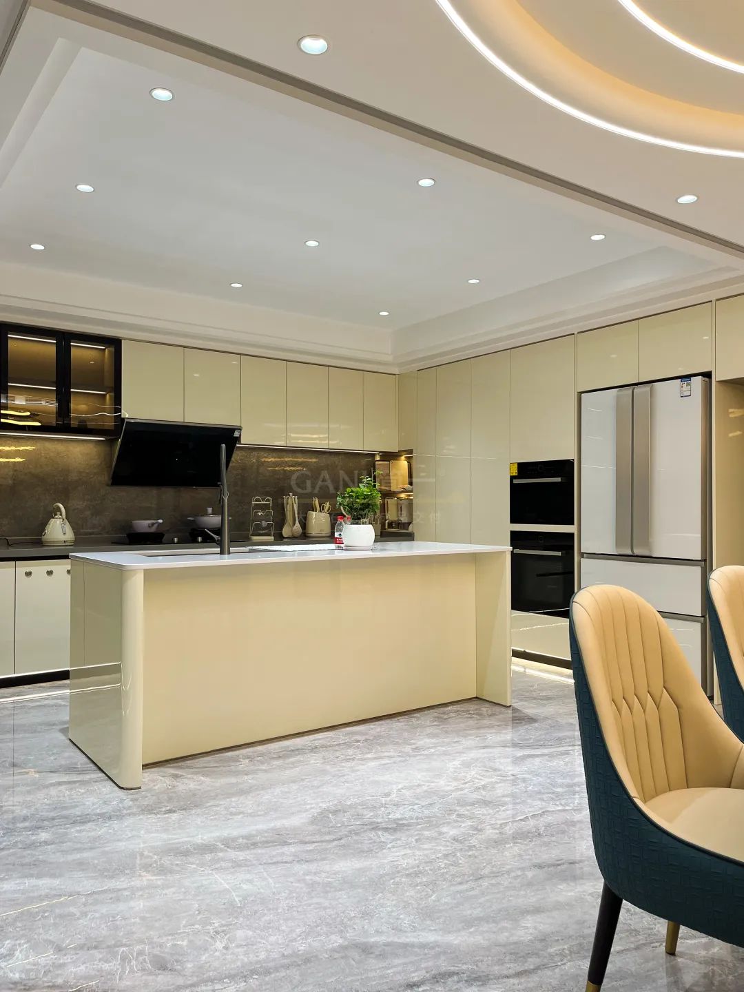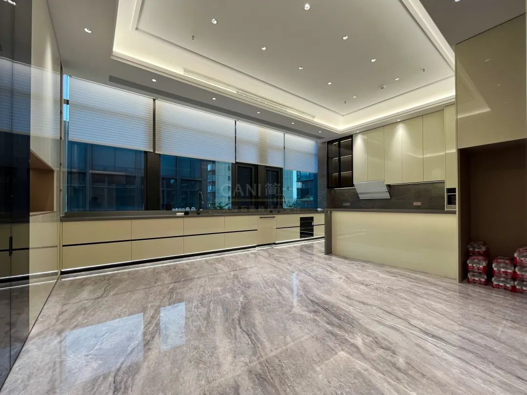 餐厨区纵向延伸形成家的自由秩序,米黄调橱柜搭配层次丰富的灰色系地砖,云朵灰大理石瓷砖在简一<0.5mm密缝无限连纹效果加持下,呈现出高级大气的融合美感。