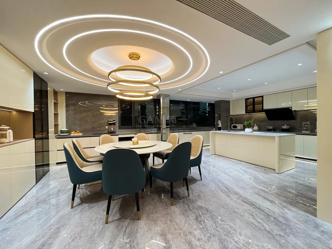 美好的瞬间,就藏在细节里。极简风环形吊灯,淡雅暖光的笼罩下让整个用餐区充满温馨生活感。