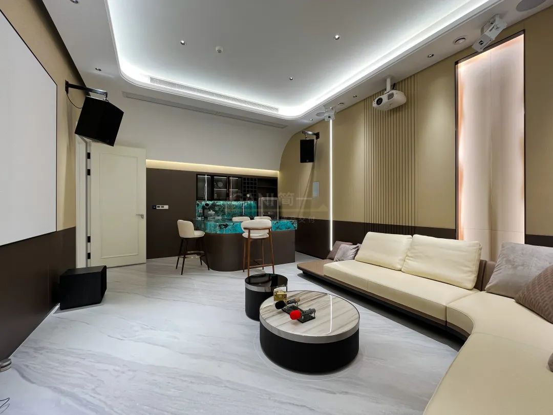 干净纯粹的暖白色,作为地下影音室的主色调,营造简洁且明亮的视觉感受。在这洁白无瑕之间,巧妙地融入翠绿色水吧岛台作为点缀,亮眼的色彩搭配提升了空间的现代美感。
