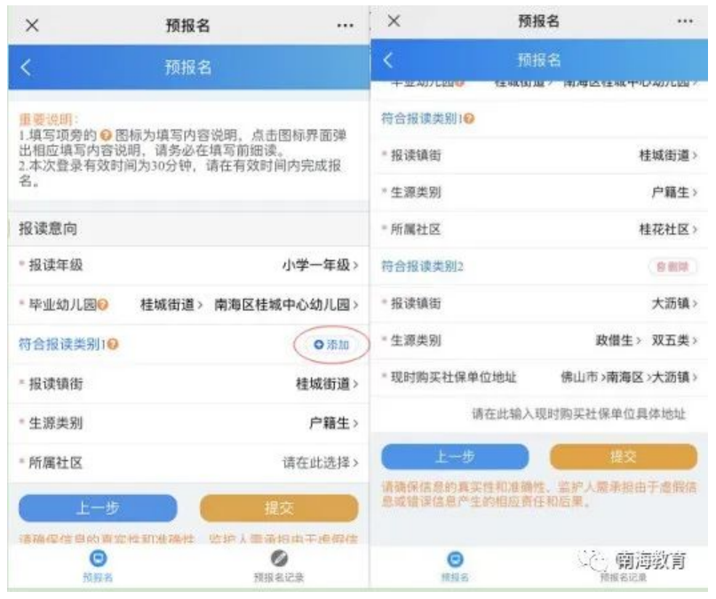 填写父母或监护人信息,点击下一步,选择报读年级、报读镇街、生源类别、在报读意向页面,选择报读年级后,选择新生所毕业的幼儿园或小学。在“符合报读类别1”信息栏下,选择报读镇街后,选择生源类别,选择所属社区。如果家长需要选报两种报读类别,可点击“添加”按钮,即可填写两个报读类别信息,如图所示(注:不清楚所属社区的可咨询当地村居)。