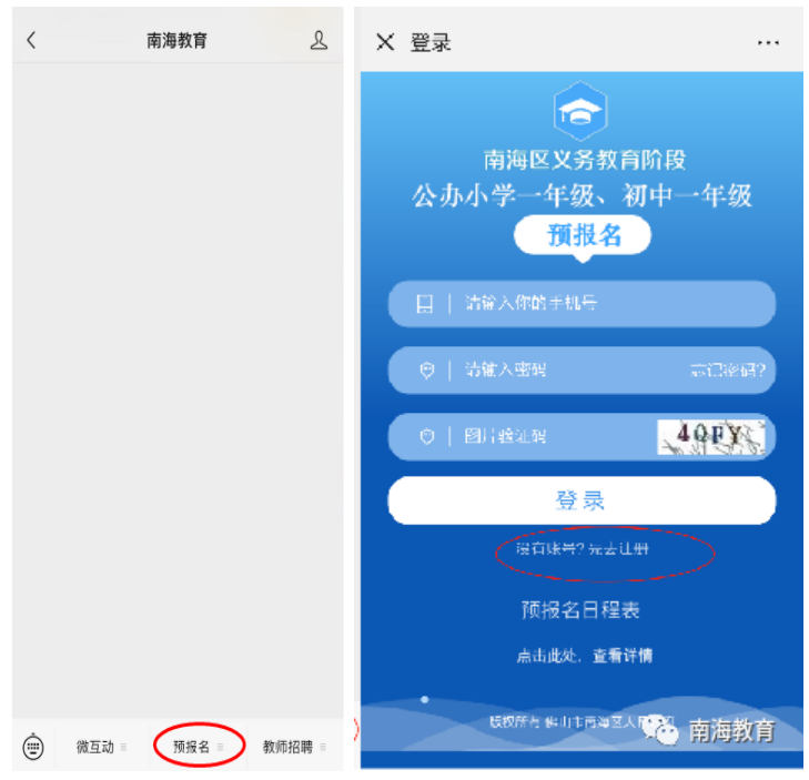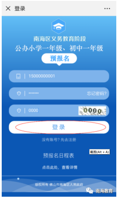 1.在2024年1月6日10:00预报名系统上线后,打开“南海教育”微信公众号,在公众号的菜单中点击“预报名”按钮,打开预报名系统登录页,如图所示。