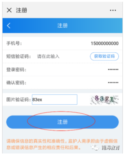 2.点击“没有账号?先去注册”按钮,打开注册页面。输入手机号后点击“获取短信验证码”按钮,将手机接收到的6位验证码填入短信码中,设置密码,再输入图片验证码后点击“注册”按钮,即可完成注册,如下图所示。