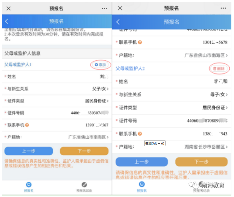 填写完新生基本信息,点击下一步,填写父母或监护人信息包括姓名、与新生关系、身份证号码、身份证类型、联系手机与户籍地。在父母或监护人信息页面,输入父母或监护人的姓名,选择与新生关系,填写父母或监护人的身份证号码,选择身份证类型,联系手机,选择户籍地。若要填写多个父母或监护人信息,可点击“添加”按钮,即可输入多个父母或监护人信息。若要删除父母或监护人信息,点击“删除”按钮,即可删除父母或监护人信息。如下图所示(注:父母或监护人信息最多能填写两个。联系手机请填写归属地在广东省内的号码)。