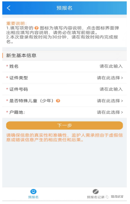 在功能菜单点击预报名,进入新生基本信息填写页面,填写新生基本信息。新生的基本信息包括姓名、身份证类型、身份证号、是否特殊儿童(少年)和户籍地。在“预报名”页面,输入新生的姓名,选择新生身份证类型,填写新生的身份证号码,选择是否特殊儿童(少年),选择户籍地。如下图所示。