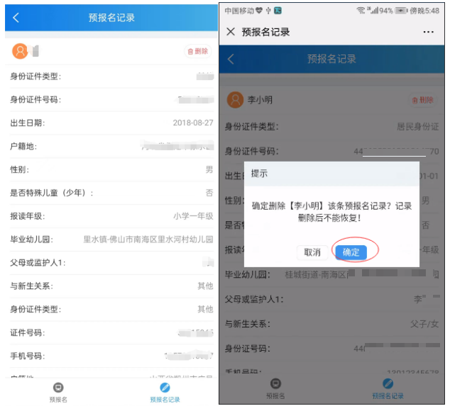 若要删除预报名记录,重新预报名,则可在预报名记录页面,点击“删除”按钮,会弹出温馨提示“确定删除[xxxx]该条预报名记录?记录删除后不能恢复!”,在提示框,点击确定按钮,即可成功删除预报名记录。如下图所示。