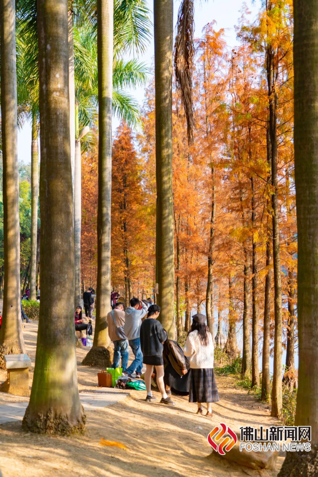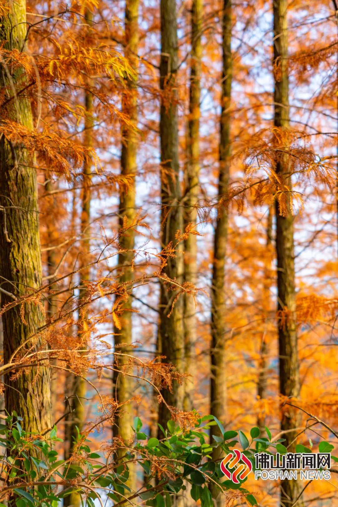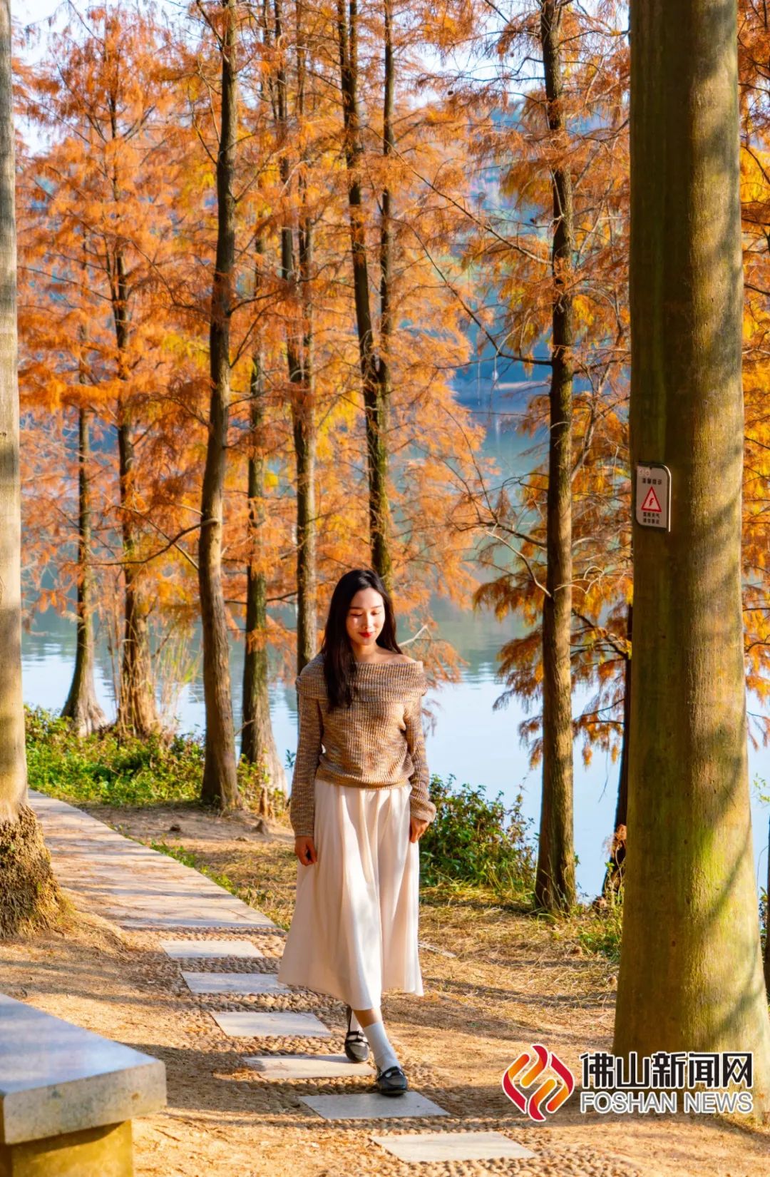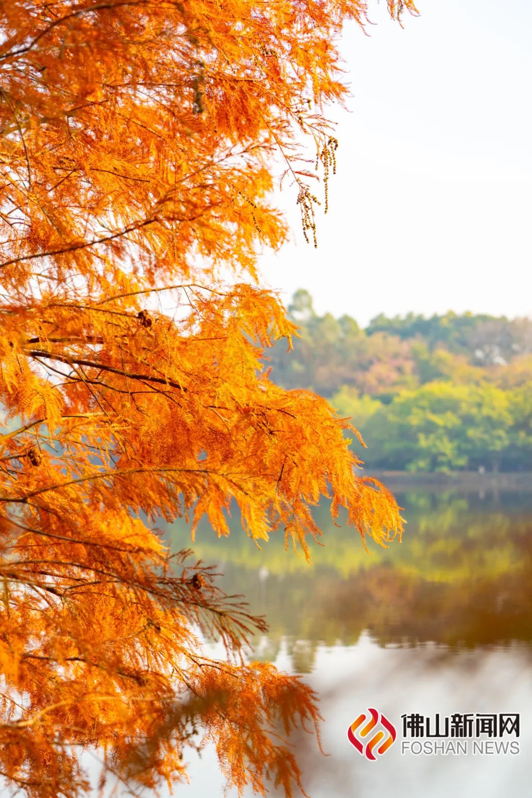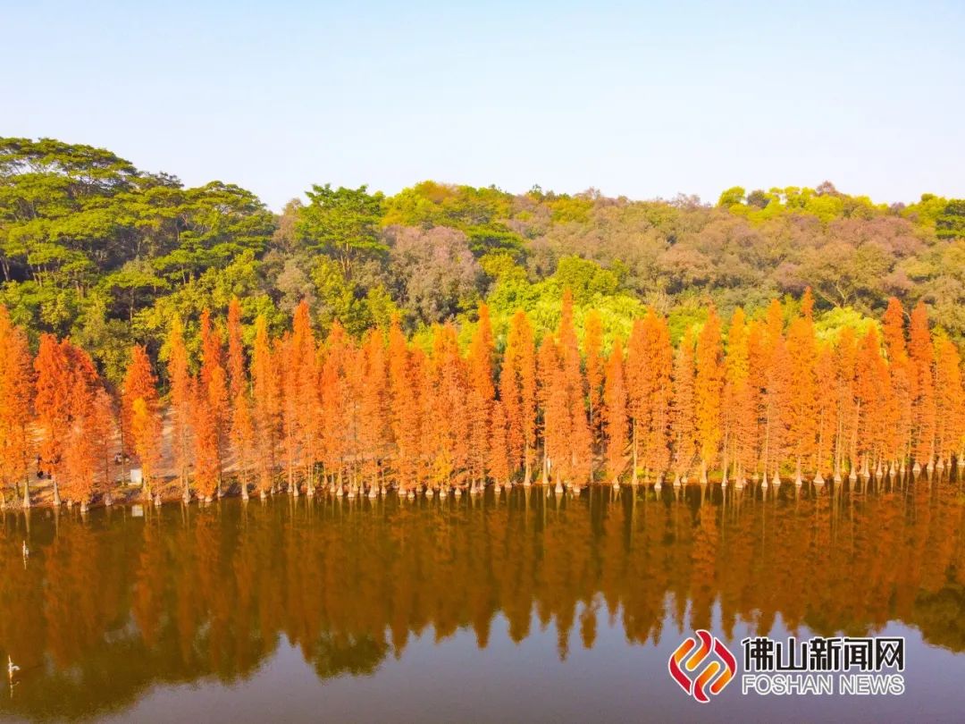 欣赏最佳地点:三水森林公园南湖绿道(免费),直接导航到三水森林公园宣言广场,沿着湖边行走就看到遍红的落羽杉林