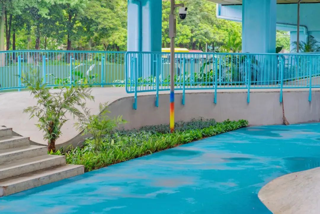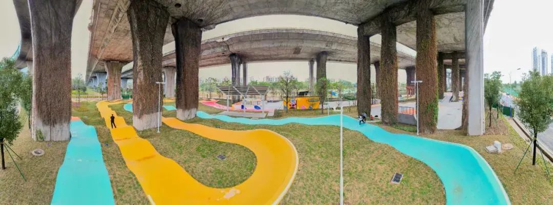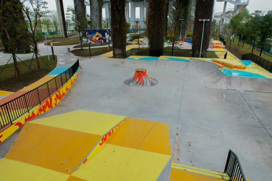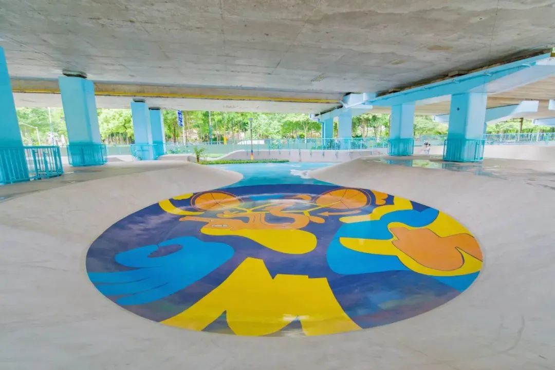 公园内还辅以蓝、黄、橙涂鸦