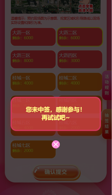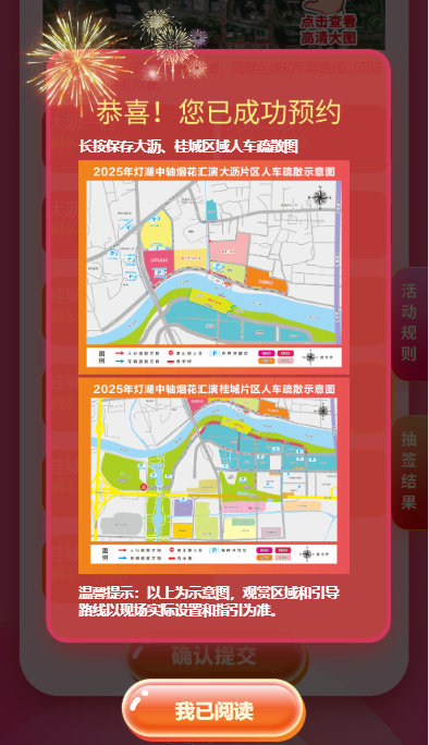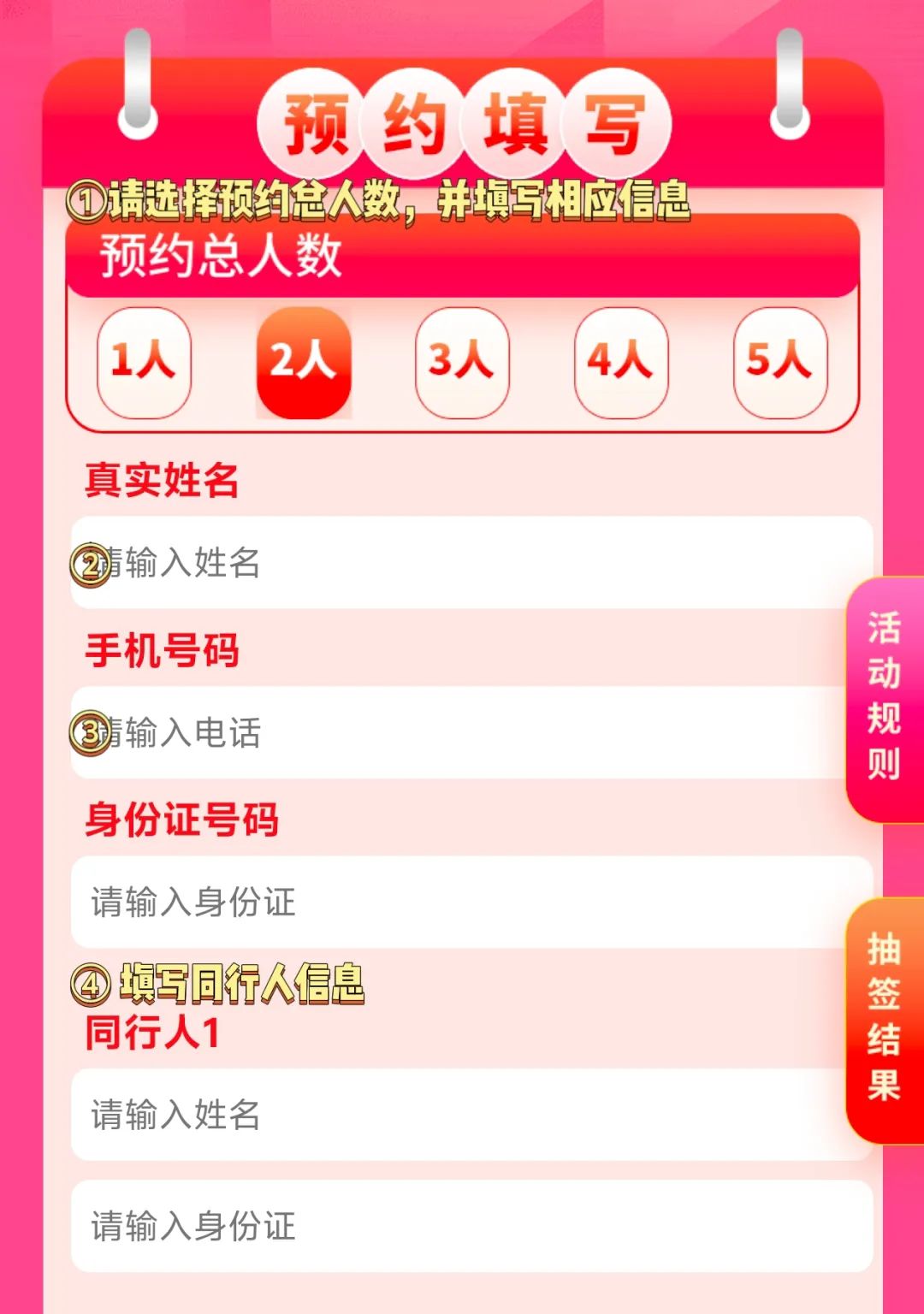 1、本次烟花汇演观赏区入场资格实行预约抽签机制,请您正确填写姓名、电话、身份证号信息,选择观赏区域、预约总人数后,点击“确认提交”;