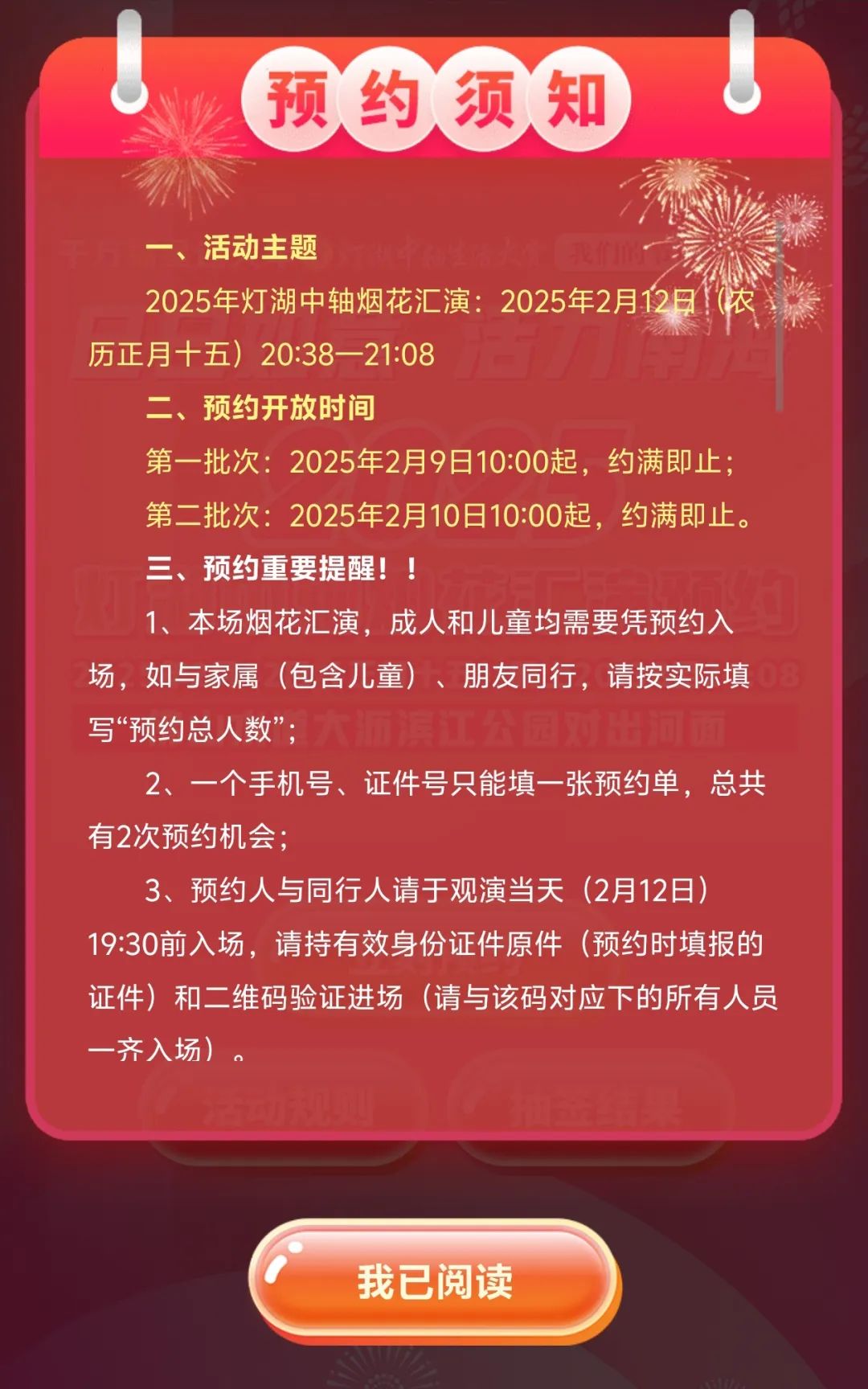 中签预约单不可转让。本次烟花汇演采用实名制预约,进场时请持有效身份证件原件,与其他同行人一同进场。