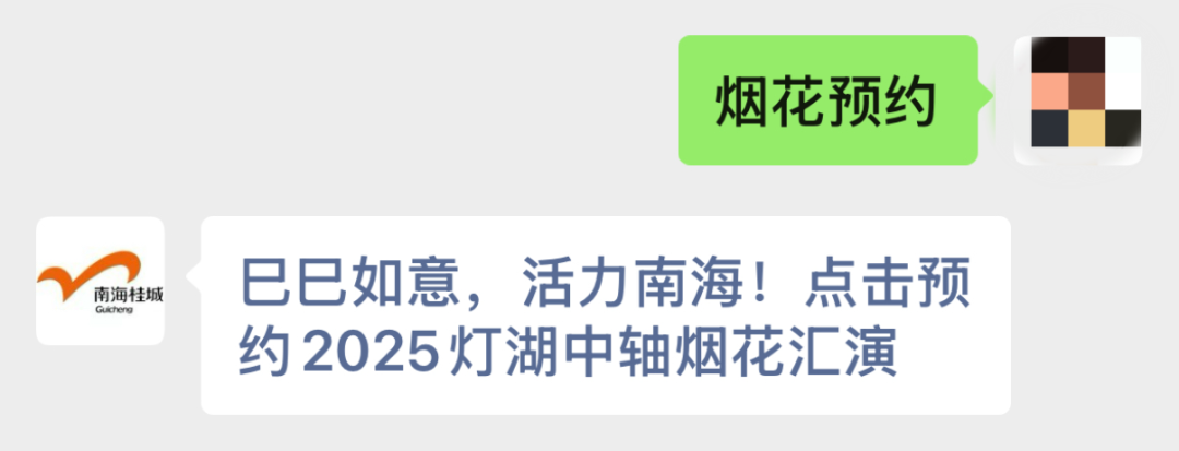 1️⃣关注“南海桂城”微信公众号,输入关键词“烟花预约”。