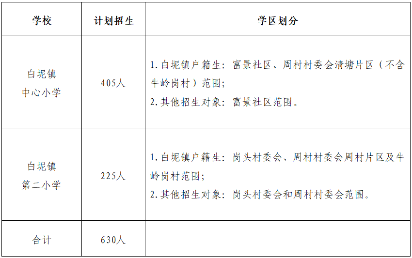 第二,安排白坭镇户籍生,根据户籍、产权房或父母工作单位所在学区就近安排入学;