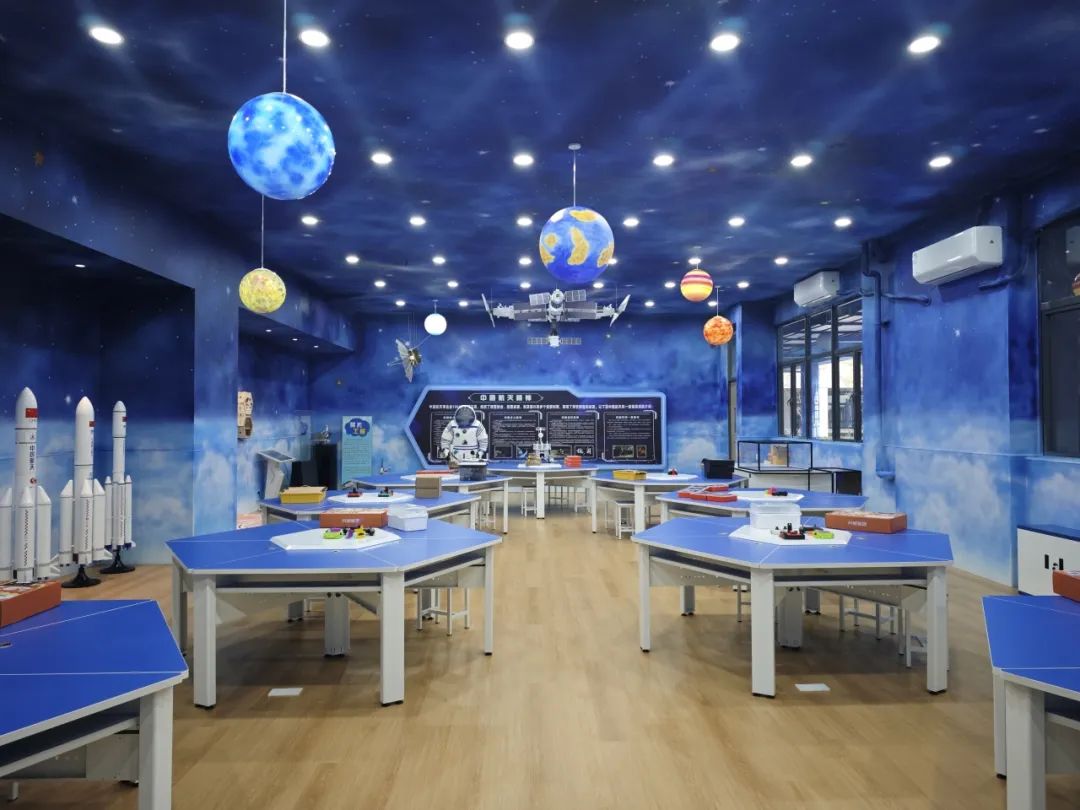 由恒洁卫浴集团捐资建成,用于航天STEAM课程实施及拔尖创新人才培养指导。走进其中,仿佛置身于太空。神舟系列火箭、北斗卫星、中国空间站……各种造型的航天器模型一应俱全,并融合人工智能、3D打印等前沿科技,为学校培养科创人才,助力学生探索太空奥秘提供良好的硬件支撑。