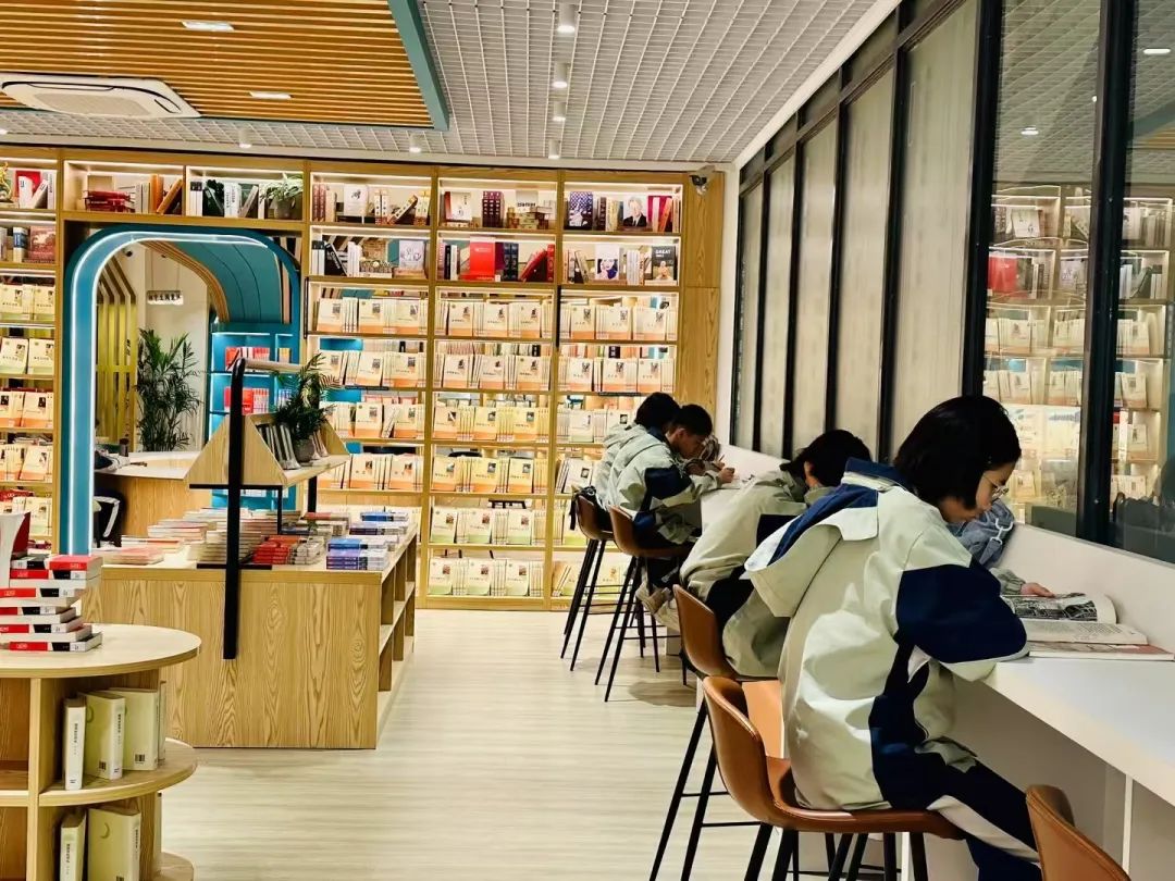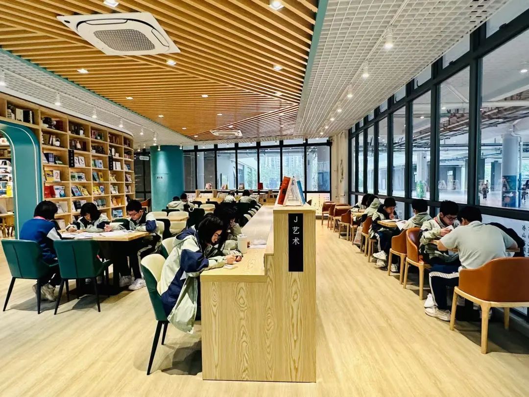 由广东教育书店捐建,打造时时能读(Anytime)、处处可读(Anywhere)、人人悦读(Anyone)、泛在接入(Anyway)、精品任读(Any high-quality books)的图书馆学习环境“新空间”,实现校社图书数据互通,自助借阅、通借通还等,获评“佛山市最美阅读空间”。图书馆每天早晨6:00开馆,由学生自主管理。早起的学生最爱在此阅读、学习。