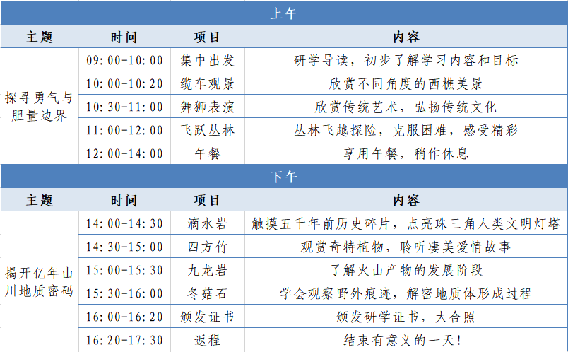 费用包含桂城往返大巴、丛林飞越门票(市价98元/人/次)、缆车、导师领队费用、午餐、保险、研学手册、证书等。