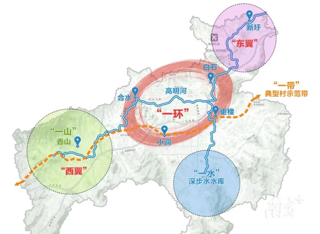 更合镇提出“大中心”概念——合水、小洞、更楼、白石成环,新圩为东翼临空门户,香山为西翼文旅纵深。抢抓“百千万工程”与新机场即将动工建设的历史机遇,将整个圩镇的面貌与人气等方面全面提升,打造“空港新城·山水更合”。