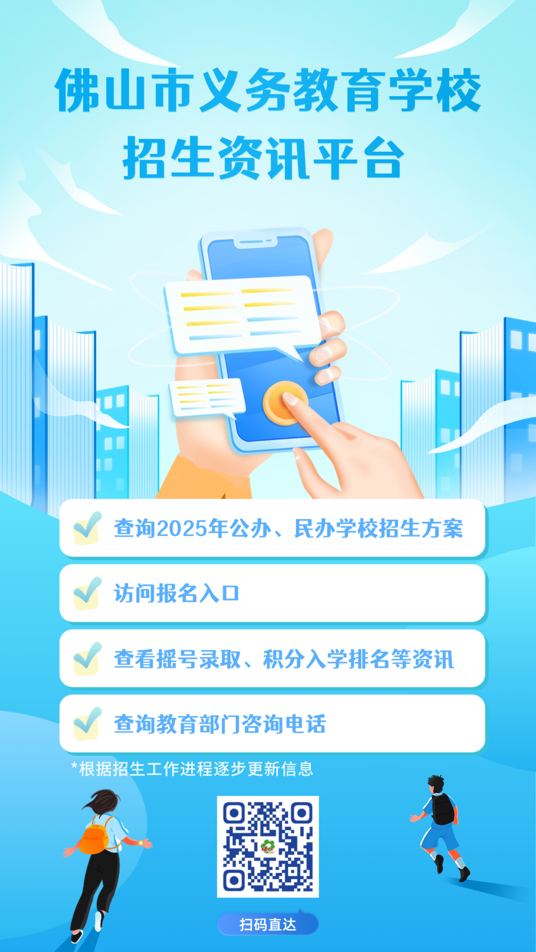 请广大家长关注“佛山教育”及属地教育行政部门官方微信公众号,了解权威招生政策。更多招生信息,可识别下方海报二维码,进入“佛山市2025年义务教育学校招生资讯平台”查询了解。