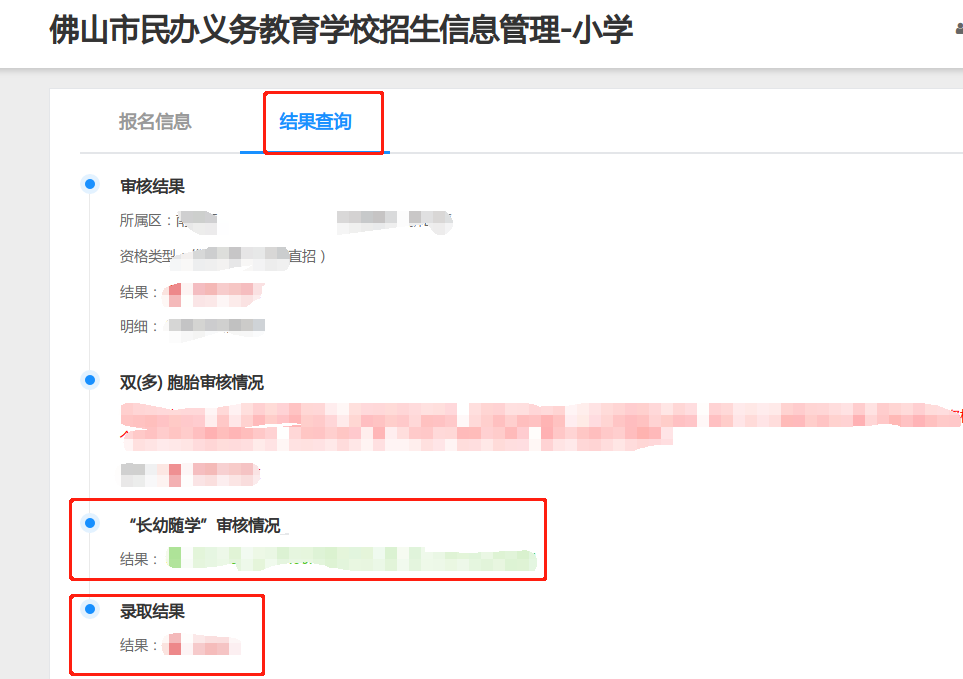 2.进入结果查询页面,可查看“长幼随学”审核结果。审核通过的可查看录取结果。