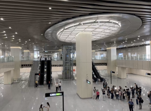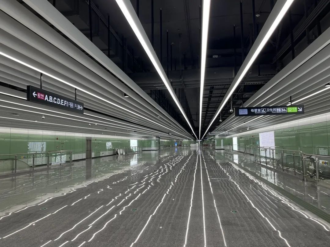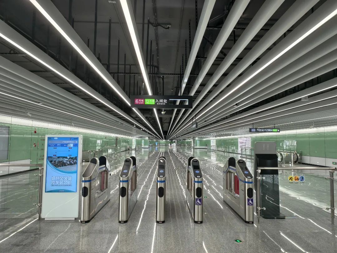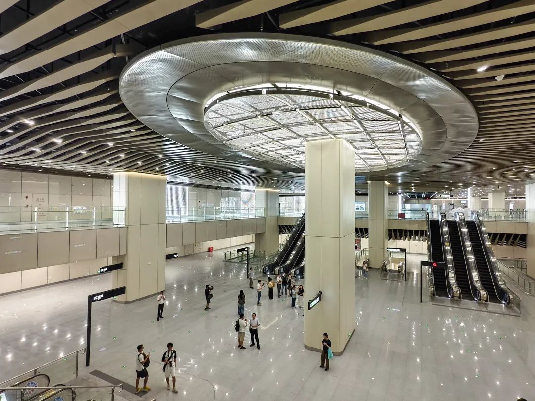 走进地铁广州白云站,映入眼帘的是中央圆弧造型“天窗”,模拟自然阳光透过白云山云雾,洒在周边吊顶,犹如蜿蜒起伏的山体,突显出乘客流线中的重要节点。该站采用“光”元素导引客流,既是功能性又是装饰性,为空间提供柔和的自然光线,同时为乘客旅程中的关键节点赋予了独特的表达方法。