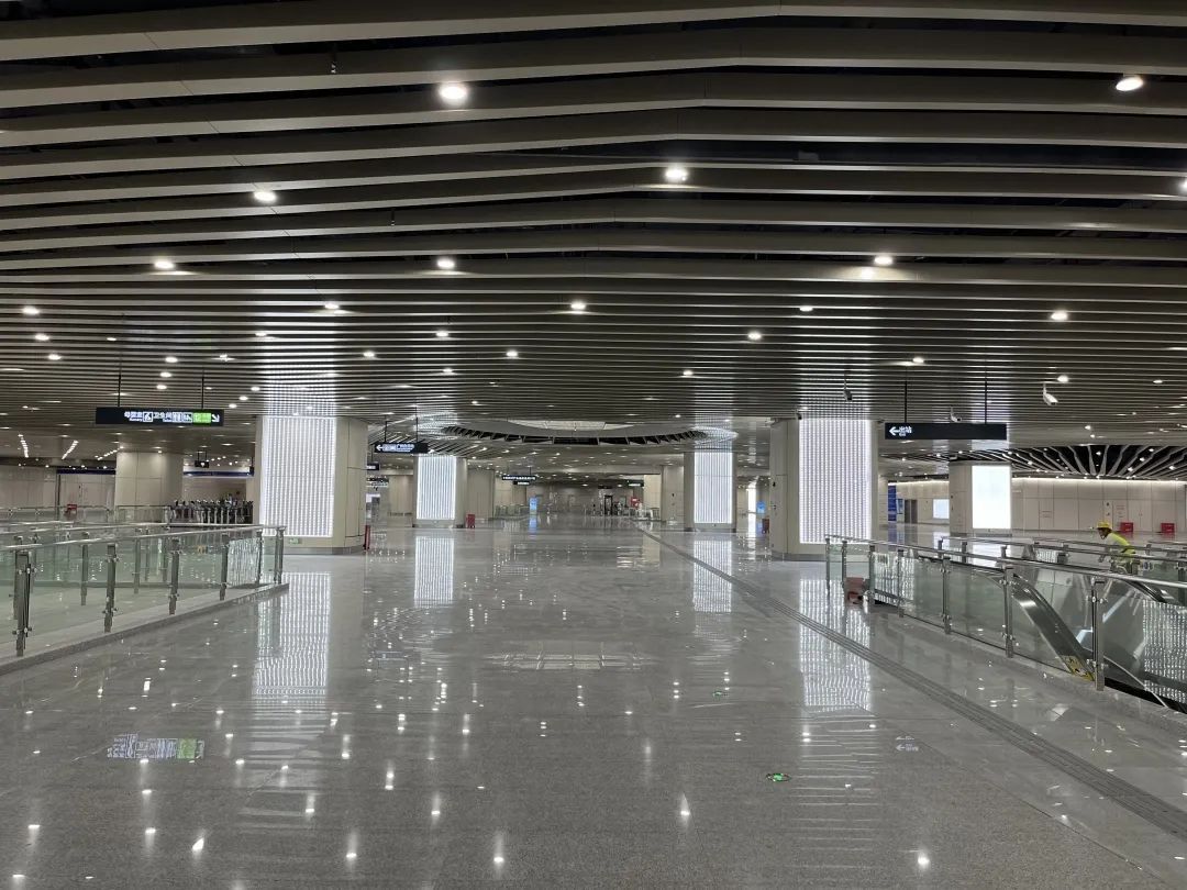 地铁广州白云站整体设计将白云山地质层理、珠江水文脉络与枢纽交通流线三重叠合,形成“山形架构、云态光影、水韵流线”的空间语法——“叠山·流云·织光”,地面抽象化“山麓基座”,采用粗犷肌理与色调,墙面演绎“山腰云带”,呈现朦胧透光层次,天花隐喻“山顶天光”,强调纯净光感与方向性。