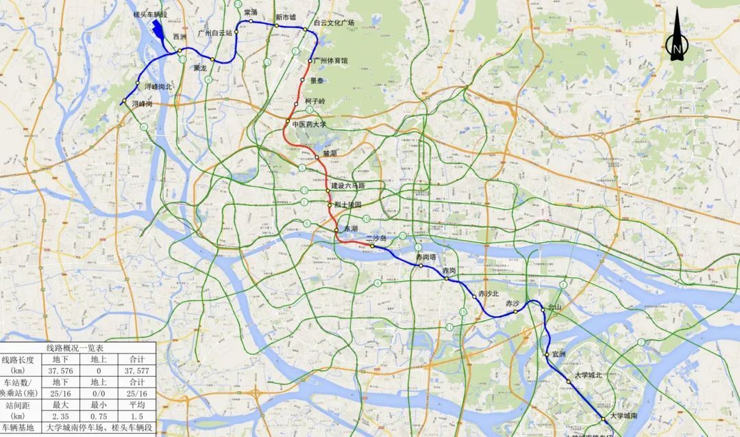 作为广州城市轨道交通线网“X”对角线中的一条,地铁十二号线线路全长约37.6公里,北起浔峰岗,南至大学城南,呈西北-东南走向,全线共设车站25座,能将南部四号线和西部金沙洲客流快速引入中心区,对于提高轨道交通线网服务水平具有重要意义。