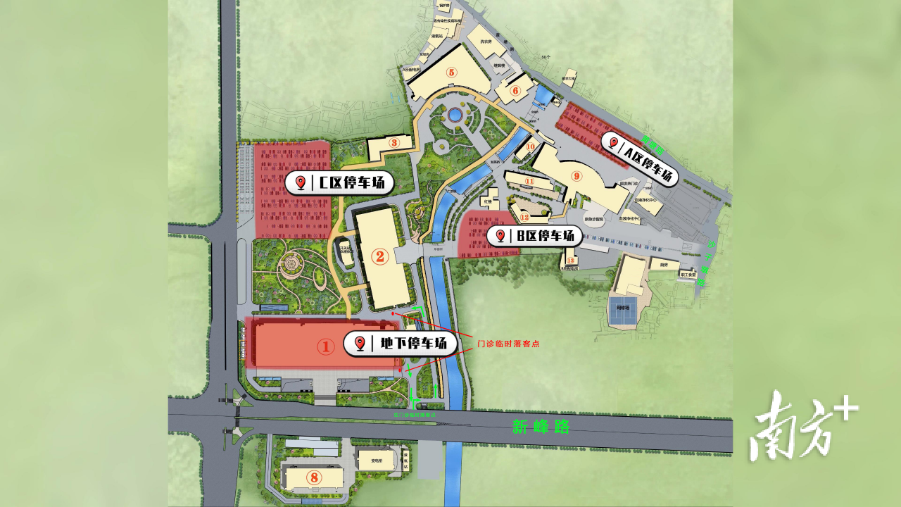 C区停车场:毗邻1号楼新门诊大楼和2号、3号住院楼。