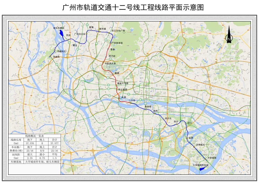 据介绍,广州地铁十二号线北起浔峰岗,南至大学城南,呈西北-东南走向,全线共设车站25座,能将南部四号线和西部金沙洲客流快速引入中心区,对于提高轨道交通线网服务水平具有重要意义。