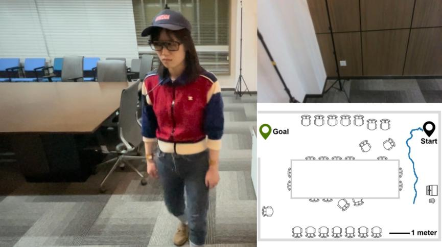 论文中的图片,视障人士借助设备在杂乱的会议室中穿行