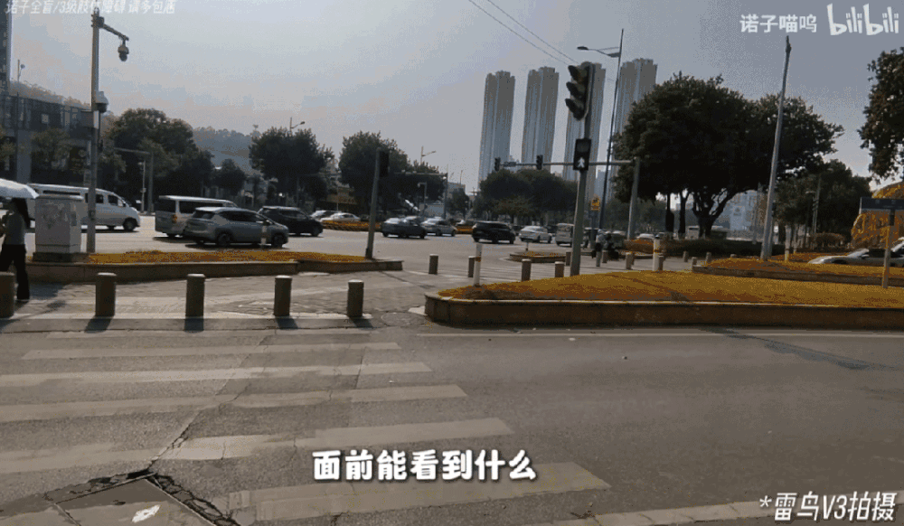 于是在粉丝的“助力”下,诺子收到了一副雷鸟V3智能眼镜。戴上眼镜,诺子再次来到那个复杂的路口前,尝试让这副眼镜帮她识别红绿灯。