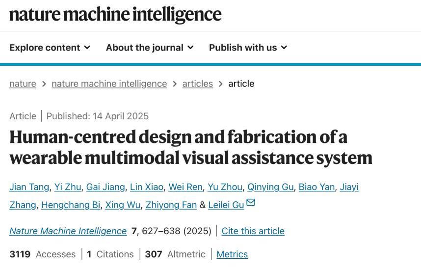 2025年4月14日,上海交通大学计算机学院清源研究院、上海人工智能实验室顾磊磊团队在《Nature》子刊《Nature Machine Intelligence》上发表了题为《Human-centred design and fabrication of a wearable multimodal visual assistance system》的研究论文,并登上了《Nature》头条。