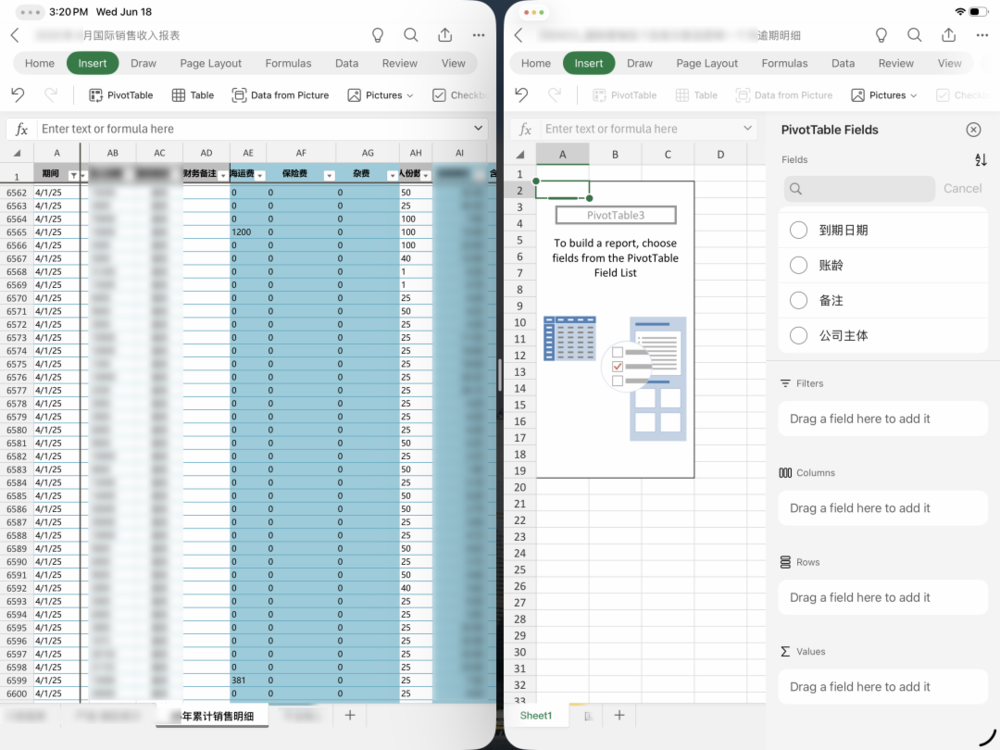以最基础的用表格数据生成透视表(pivot table)为例,哪怕放在面积最充裕的13寸iPad上,Excel用于添加透视表过滤器的界面因为需要考虑触屏操作而将UI控件放的很大,一旦筛选项超过三四个,所需的点击和拖拽操作就会变成一种折磨。