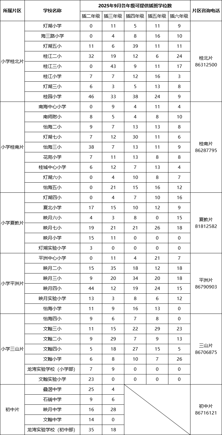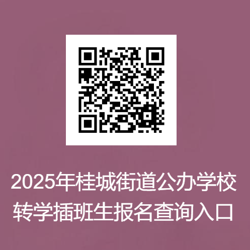 各位桂城家长注意! 2025年桂城街道公办学校 转学插班报名通知正式发布! 6月26日7:00起可在线报名 以下内容请仔细阅读 根据《广东省教育厅关于中小学生学籍管理的实施细则(试行)》【粤教基〔2014〕24号】以及《佛山市南海区教育局关于做好2025年义务教育阶段学校招生工作的通知》(南教基〔2025〕43号),结合桂城街道义务教育阶段公办学校学位实际,制定《2025年桂城街道义务教育阶段公办学校非起始年级转学插班工作方案》,具体如下: 第一类:桂城户籍生。是指2025年6月25日前(含6月25日当天)入户在册的桂城户籍生。 第二类:符合条件的军人子女及消防救援队伍人员子女。 第一类 桂城户籍插班生 1. 家长用手机或电脑登录https://www.wjx.cn/vm/tsvH1x7.aspx# 在线填写《2025年桂城街道公办学校转学插班生报名表》。 2. 家长准备好以下资料,报名后由公安部门核查学生桂城户籍信息,由教育部门核查学生的学籍信息。若通过审核统筹安排了学位,家长于7月中旬到接收学校报到时交学校存档。 ①学生及父母的户口簿复印件(须含户口簿首页、学生及父或母所在页)。 ②学生的全国学籍号(可联系现就读学校的班主任协助查询)。 第二类 符合条件的军人子女及消防救援队伍人员子女插班生 按市、区教育局联同相关职能部门审核确认下发的名单统筹安排。军人子女及消防救援队伍人员子女享受教育优待申请办法请咨询本单位政工部门。 说明: 1. 请家长认真阅读《2025年桂城街道公办学校转学插班生报名通知》,用手机或电脑登录https://www.wjx.cn/vm/tsvH1x7.aspx#在线填写《2025年桂城街道公办学校转学插班生报名表》,报名后由公安部门核查学生的户籍信息,由教育部门核查学生的学籍信息。军人、消防人员子女转学插班按市、区教育局联同相关职能部门审核确认下发的名单统筹安排。 2. 家长可以联系现就读学校的班主任协助查询学生的全国学籍号,若有特殊请向报名片区咨询并说明情况。 3. 现已在桂城街道内公办学校就读的学生不接受转学插班申请。 4. 学生正在休学或受处分期间的不接受转学插班申请;申请在原年级复读的不接受转学插班申请。 5. 所有证件、证书、证明的复印件需由申请人父或母(监护人)手写“该复印件由本人提供,真实有效”,并由申请人父或母(监护人)签名。 6. 申请人父或母(监护人)申请时不得瞒报实际就读年级,如果瞒报,将取消学位,由此造成的不良后果由申请人父或母(监护人)负责。提供虚假资料或信息的,取消报名资格。 1. 转学插班生学位有限,需根据公办学校各年级学位情况在全街道内统筹。 2. 现已在桂城街道内公办学校就读的学生不接受转学插班申请。 3. 申请人参照《转学插班片区划分及公办学校可提供的插班学位数一览表》,结合自身实际限报1个片区,在该片区内有插班学位的学校中选报1-3个志愿,家长可按意愿先后选择,报名系统将按家长点选学校的先后顺序进行志愿排列。各片区通过报名、审核符合转学插班资格的,由桂城街道教育部门通过电脑随机摇号方式统筹安排学位。插班生电脑随机摇号方案在7月上旬另行公布。 4. 实行双(多)胞胎同号,如果双(多)胞胎同时报名插班同一年级,请在报名小程序中填写双(多)胞胎信息。已填写双(多)胞胎信息的,则默认为按相同的意愿学校及相同的志愿顺序进行报名,并同号参与电脑随机摇号。 5. 当申请人所报的1-3个志愿都未能中签,若申请人在报名时选择“接受剩余学位调配”的,电脑随机摇号时,若所报片区对应年级已报志愿都中签后仍有剩余学位,摇号系统会为“接受剩余学位调配”的申请人随机派位中签学校,如所报片区因学位不足而没有中签的,由桂城街道教育部门根据其他片区学校剩余学位情况统筹安排,若其他片区没有剩余学位,则告知申请人暂缓转学;若申请人在报名时选择了“不接受剩余学位调配”的,桂城街道教育部门不再接受插班剩余学位调配申请,申请人暂缓转学。 6. 凡报名即视为全部认可本转学插班方案。申请人不接受摇号结果或不接受统筹的,视为放弃学位。 7. 若家长(监护人)对学位安排有异议,应按照合法途径反映。若因家长(监护人)实施过激行为影响招生工作的顺利推进,家长(监护人)应承担一切法律后果。 在线报名时间:2025年6月26日7:00-6月27日22:00截止,逾期不再受理转学插班申请。 (一)在线报名网址: https://www.wjx.cn/vm/tsvH1x7.aspx# 或扫描下方二维码在线报名。 (二)报名查询网址: https://www.wjx.cn/resultquery.aspx?activity=276225056 在报名期限内,家长可登录查询网址或扫描下方二维码,输入学生姓名、身份证号码查询已报名的信息。 提醒: 请家长认真阅读《2025年桂城街道公办学校转学插班生报名通知》,如实填写报名程序中每项报名信息,报名后由公安部门核查学生的户籍信息,由教育部门核查学生的学籍信息,发现提供虚假信息的,取消报名资格。特别注意以下几点: 1. 报名信息提交后只能提供查询(在报名期限内,家长可登录上方查询网址输入学生姓名、身份证号码查询已报名的信息),已提交的报名信息不能再撤回修改,请家长务必反复核对确认无误后再提交。若确需修改,家长只能重新填报一次,系统会自动识别家长最后一次报名信息,同一个人如有多条报名记录,以最后一次提交的报名信息为准。 2. 报名结束后,由桂城街道教育部门导出报名信息进行