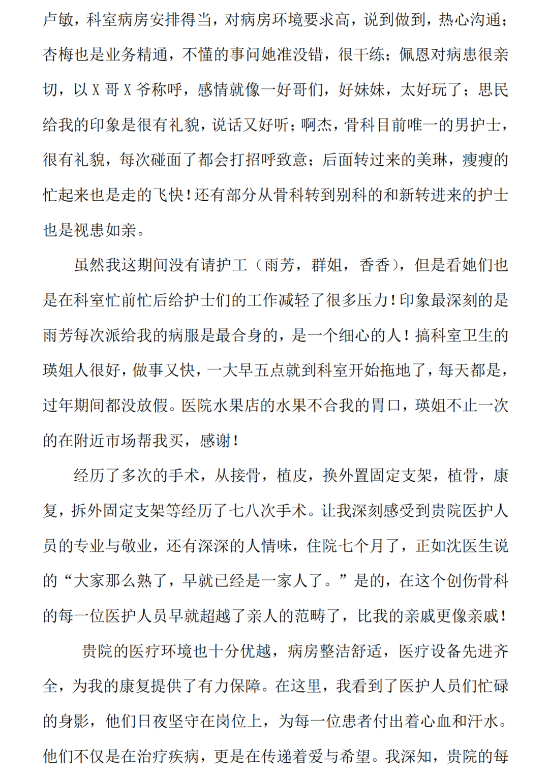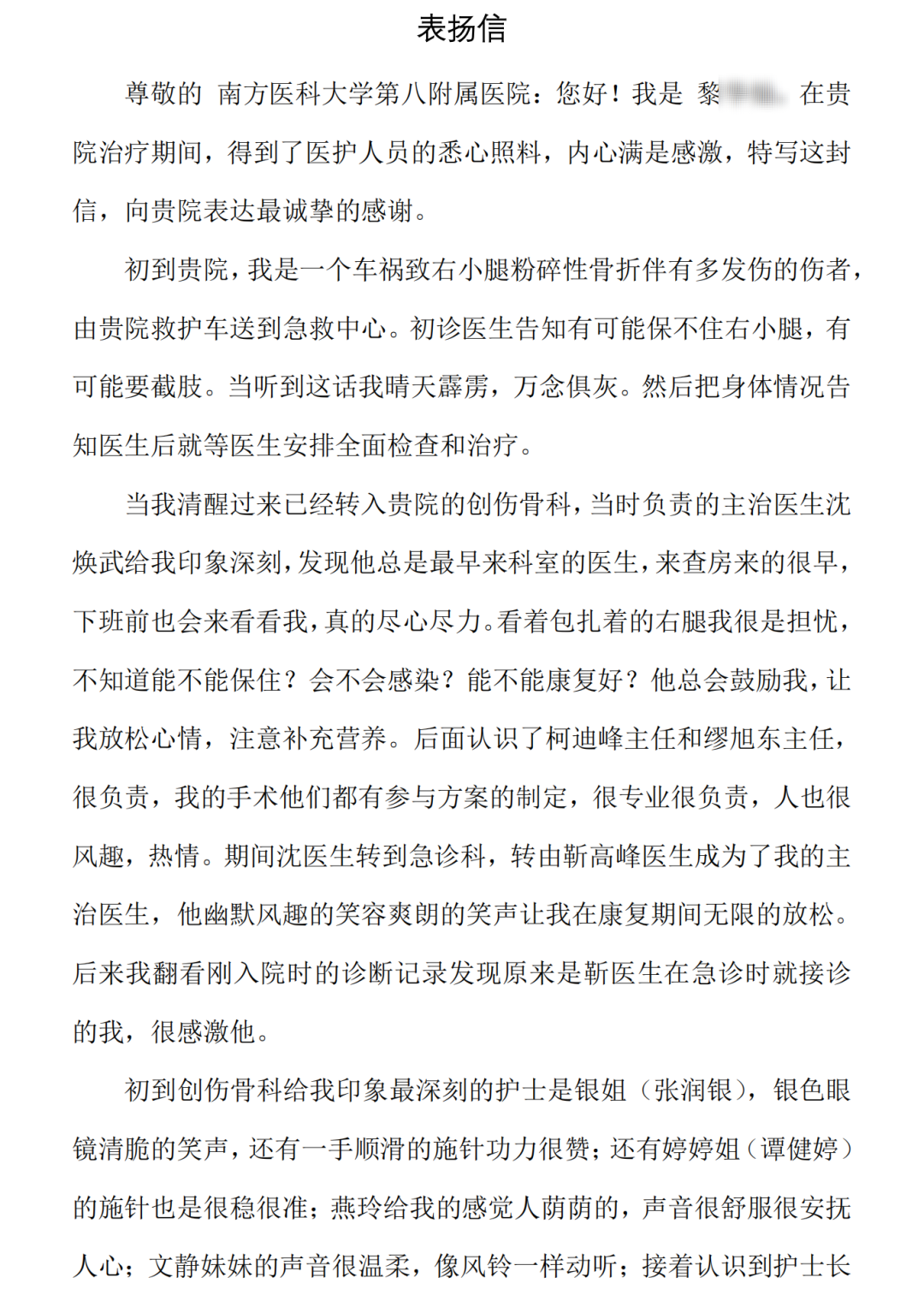 出院当天,黎先生一家送来锦旗和长达3页的感谢信。信里提及对医护人员精心诊治的褒扬:“……在这个创伤骨科的每一位医护人员早就超越了亲人的范畴了,比我的亲人更像亲人……”。
