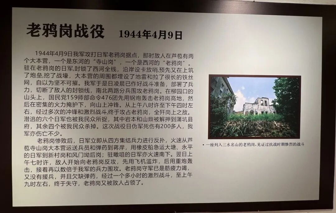 当时,距离老鸦岗最近的村头村等村落聚集了大量难民,三水县政府成立的抗日救亡政治工作队有10多位女共产党员,她们以办夜校、妇女识字班等形式开展战时妇女工作,还筹措资金开办火柴厂,组织难民生产自救,为中国军民抗击日寇积蓄力量。