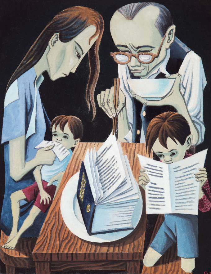 廖冰兄的《教授之餐》,刻画了一家四口围坐餐桌的场景,反映战时知识分子的困境。作品以紧凑朴素的构图,既呈现物质匮乏的窘迫,又通过孩子专注读书的姿态,隐喻对文化传承的坚守。
