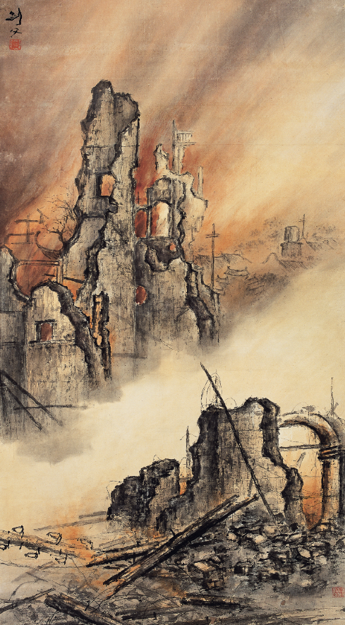 《东战场的烈焰》原题《淞沪浩劫》,是描绘1932 年“一·二八淞沪抗战”中遭到日军炮火轰炸的上海闸北的“写真画”。高剑父这件作品的构图方式和视觉张力,以具有遥深感的视觉元素,赋予图像以更丰富的信息量和想象力。