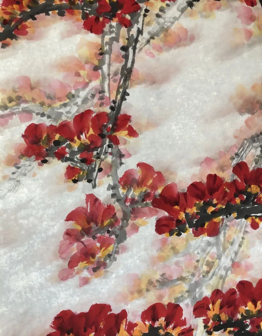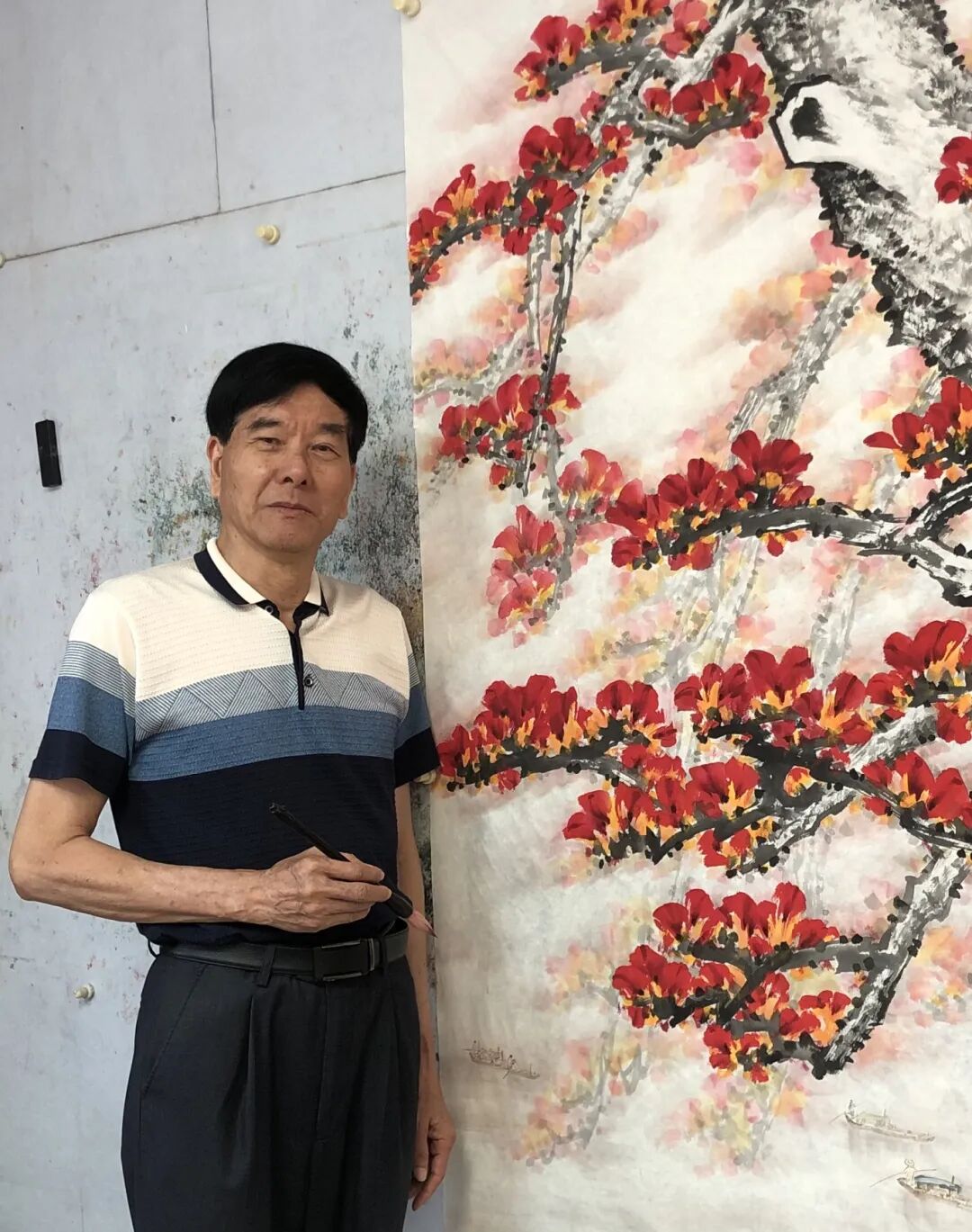 作品《南国春晓》以红棉入画,苍劲虬枝破雾凌空,胭脂点染的花簇如朝霞凝露,灼灼其华。江面轻舟隐现于氤氲墨色间,似被晨风推入画中,浓淡相生的笔法将南国湿漉漉的春晓烘托得虚实交映。整幅画铁血柔情并蓄,雄浑处见枝干峥嵘,温婉处有烟水空濛,诚为岭南风物的淋漓写照。