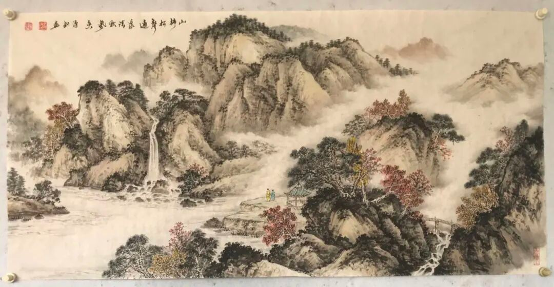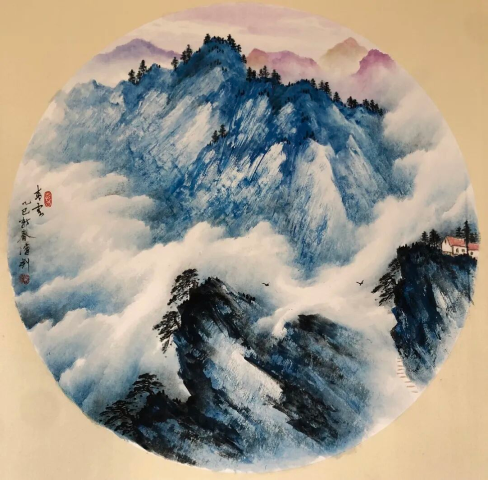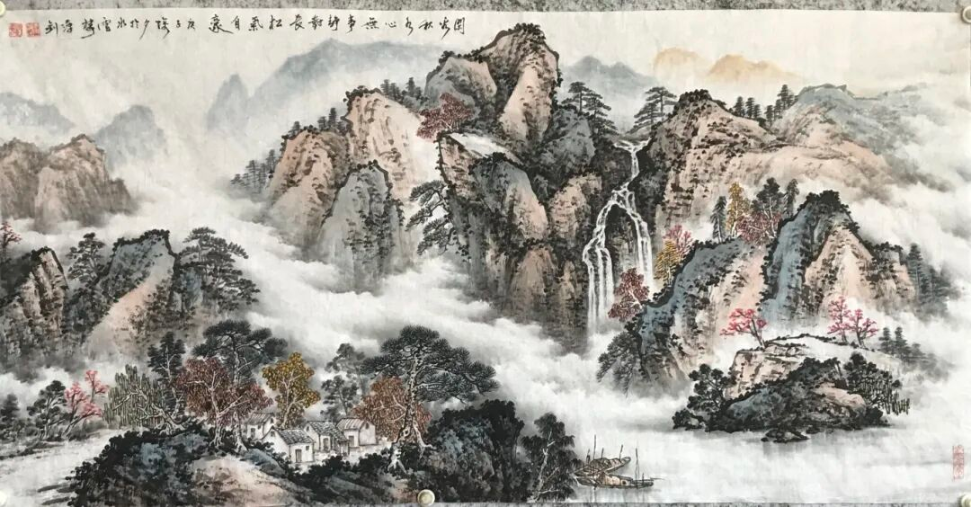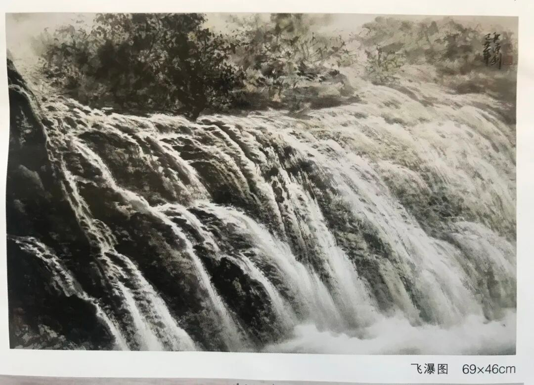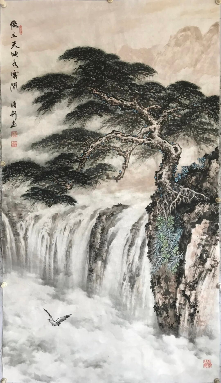 他的山水画手法多样、风格各异。“多法之法”与“无法是法”是他的创作及创新理念。“多法之法”即多吸取借鉴古今各家各派的技法,融入自己的理解,综合运用到创作上来,“无法是法”则是不被某一家某一种技法所囿,融会贯通,自成一格。