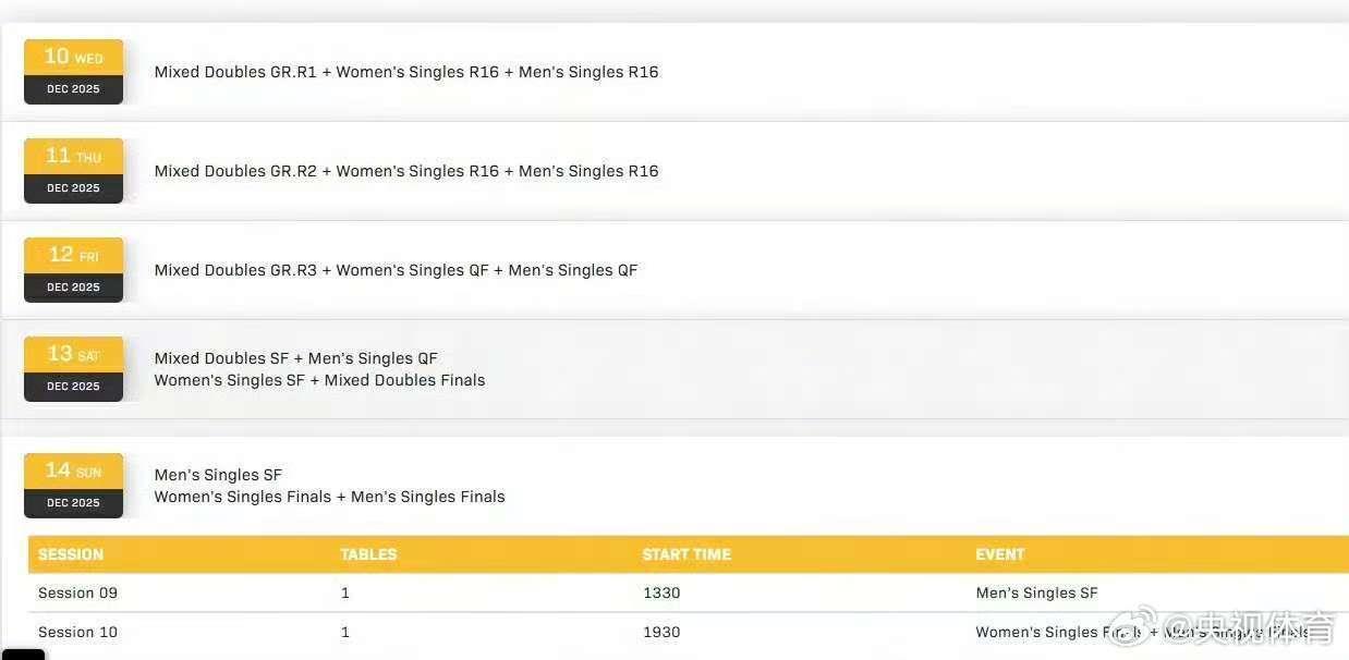 2025WTT香港总决赛赛程公布,比赛将于12月10日—14日在中国香港红磡体育馆进行,具体安排如下: