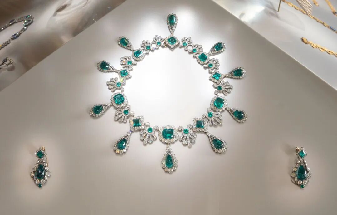 1810年前后,拿破仑为他的第二任妻子玛丽-路易丝准备了数件结婚礼物,就包括这条祖母绿项链和耳环。项链镶嵌有32颗哥伦比亚祖母绿和1138颗钻石,曲线优美。