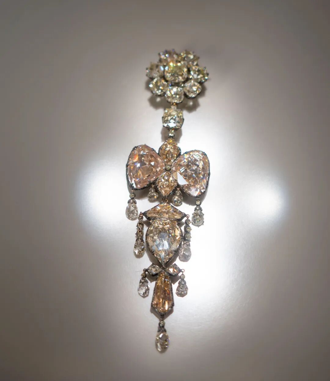 这枚“圣物”钻石胸针,制作于1855年,镶有数颗令人目瞪口呆的巨型钻石。胸针中央的两颗心型钻石,是红衣主教马萨林遗赠给路易十四的礼物(马萨林钻石17与18),还有钻石曾镶嵌在路易十四的外套、玛丽-安托瓦内特王后的耳环上。这对钻石幸免于经历了1793年法国大革命、1887年法国王室珠宝拍卖,现在却被劫匪带走。