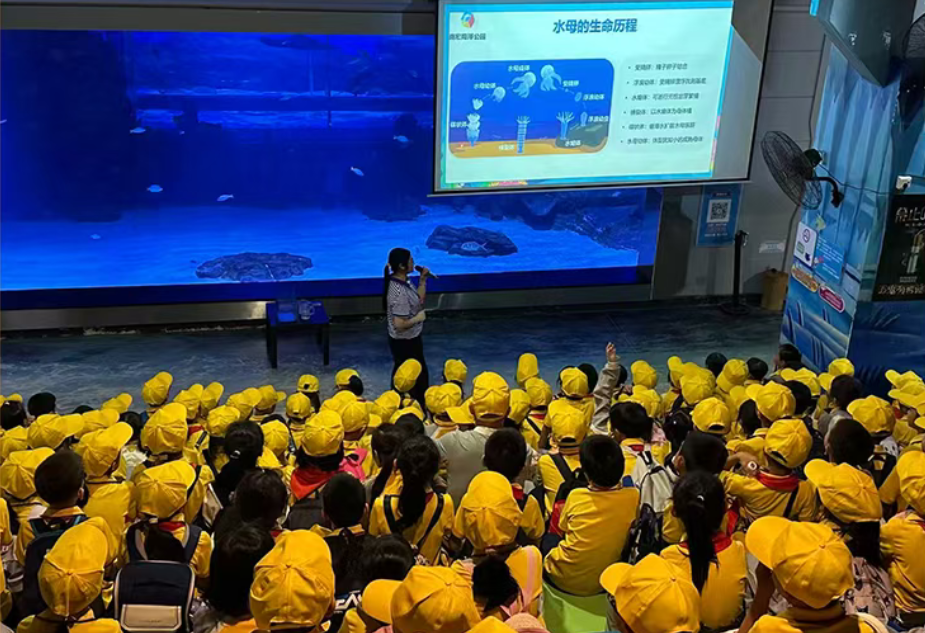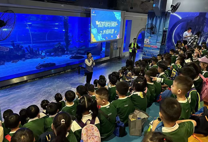 顺德南宏海洋公园秋假研学活动打造了集动物科普、海洋演艺与综合体验于一体的沉浸式研学课堂。同学们不仅可近距离观察水母、羊驼、水豚等动物,通过理论讲解与互动实践相结合的方式,在生动有趣的氛围中学习生物知识,更可将水母带回家,延续观察与思考。