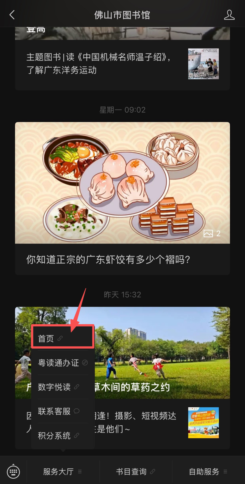 (一)打开“佛山市图书馆”公众号,点击左下角“服务大厅-首页”,进入页面;