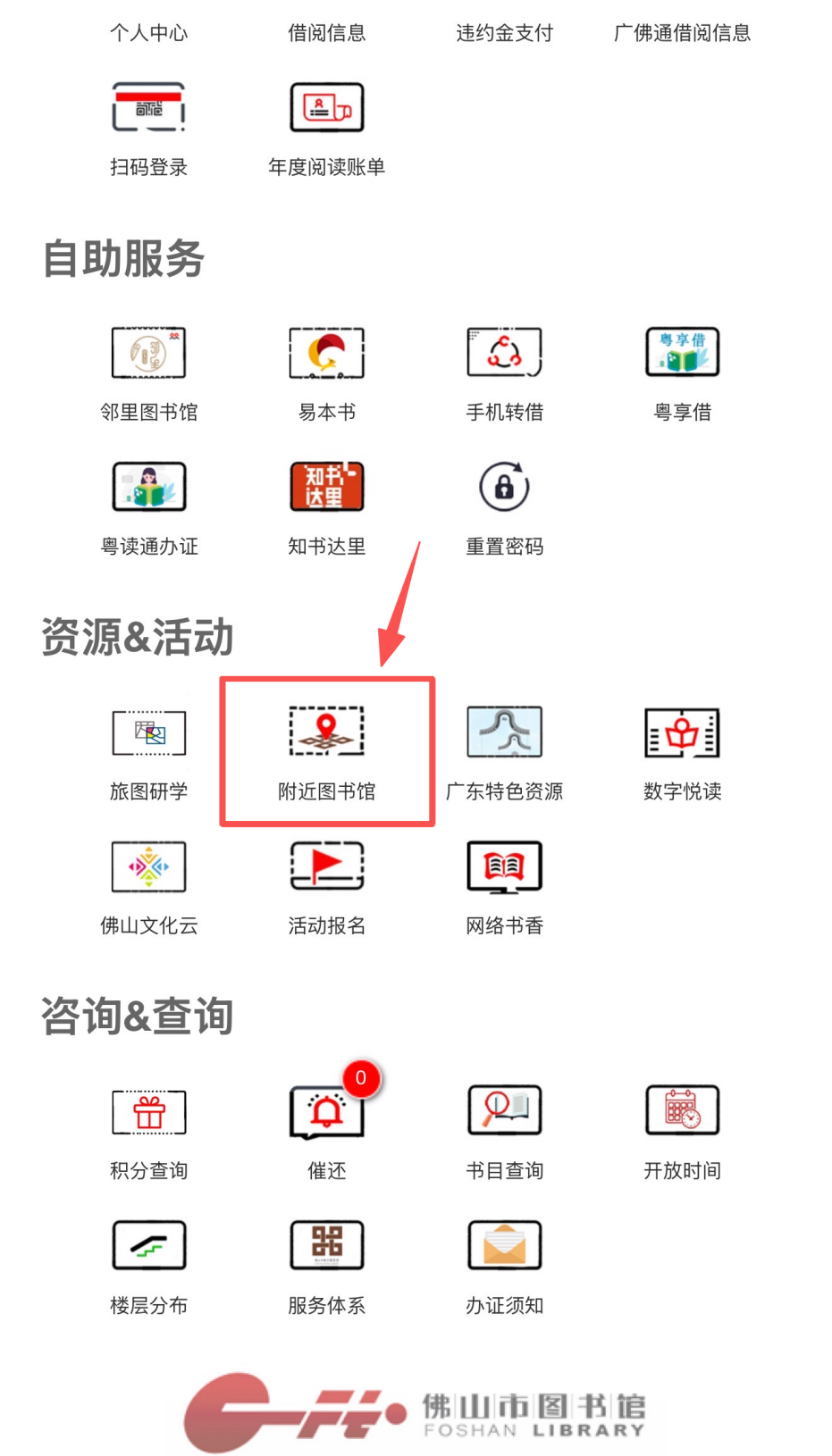 (二)往下滑动,在“资源&活动”中找到“附近图书馆”;