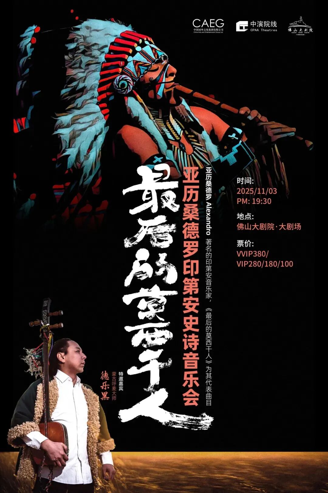 2025年11月3日(周一)19:30,佛山大剧院大剧场,这场音乐对话将迎来更具深意的共鸣——蒙古呼麦大师德乐黑的加入,让安第斯高原的风与蒙古草原的云在华夏大地上空相遇。印第安音乐与蒙古音乐,这两颗世界音乐明珠,终以“旷野之声”的名义,谱写出一曲跨越大洋的史诗交响。