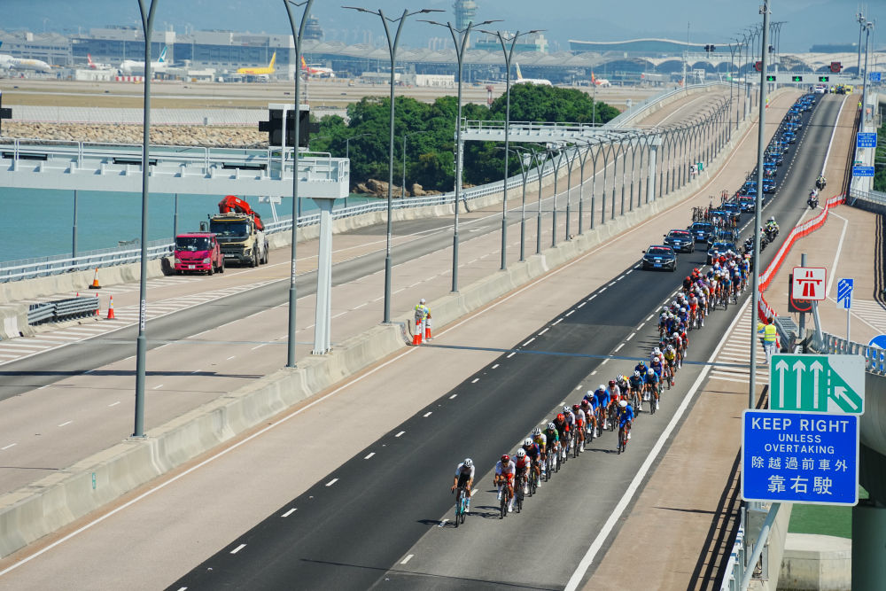 11月8日,参赛选手在比赛中。当日,第十五届全国运动会公路自行车男子个人赛决赛开赛,全程231.8公里,选手将经过港珠澳大桥,跨越粤港澳三地。这是全运会历史上首次举办跨境比赛。新华社记者 朱炜 摄