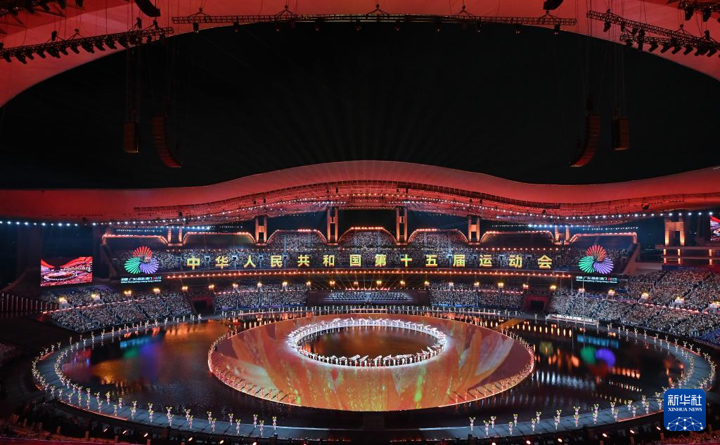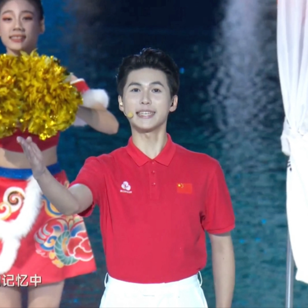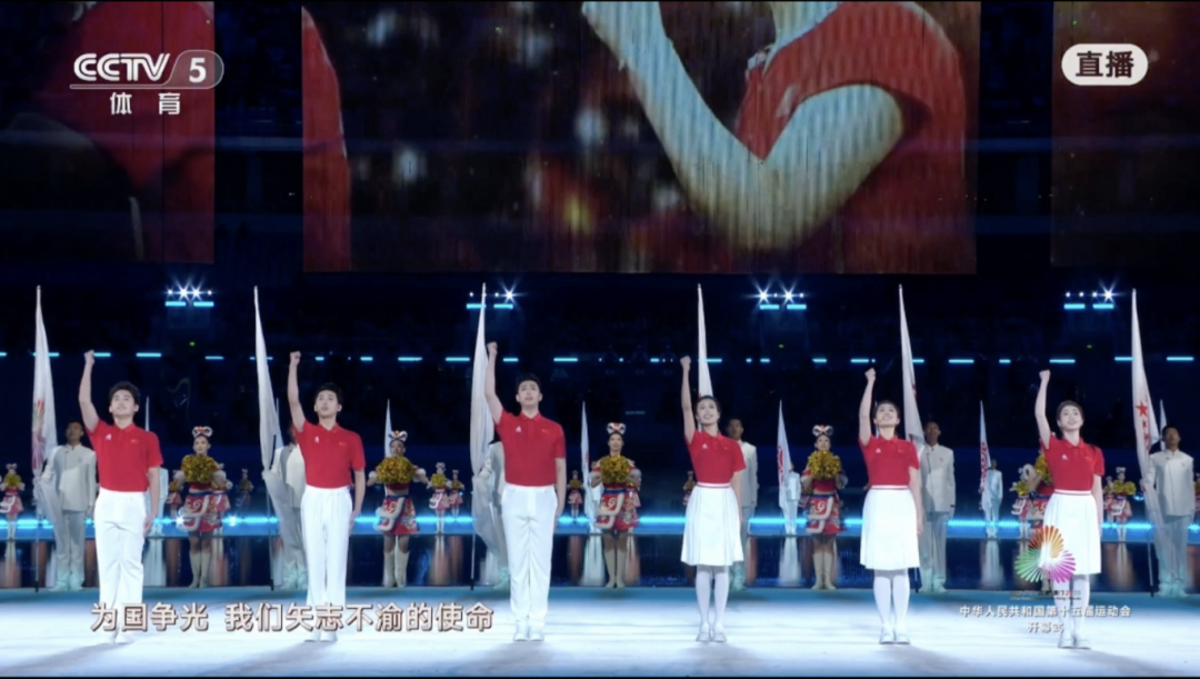 ▲中华人民共和国第十五届运动会开幕式《中华体育精神颂》直播截图。左二为三水学子汪粤
